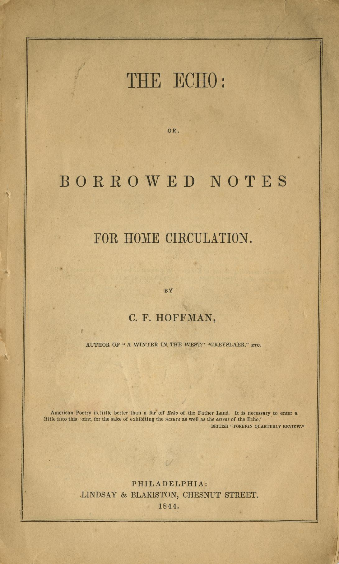 Hoffman, Charles Fenno. The Echo: or Borrowed Notes for Home Circulation. Philadelphia: Lindsay & Blackiston, 1844.