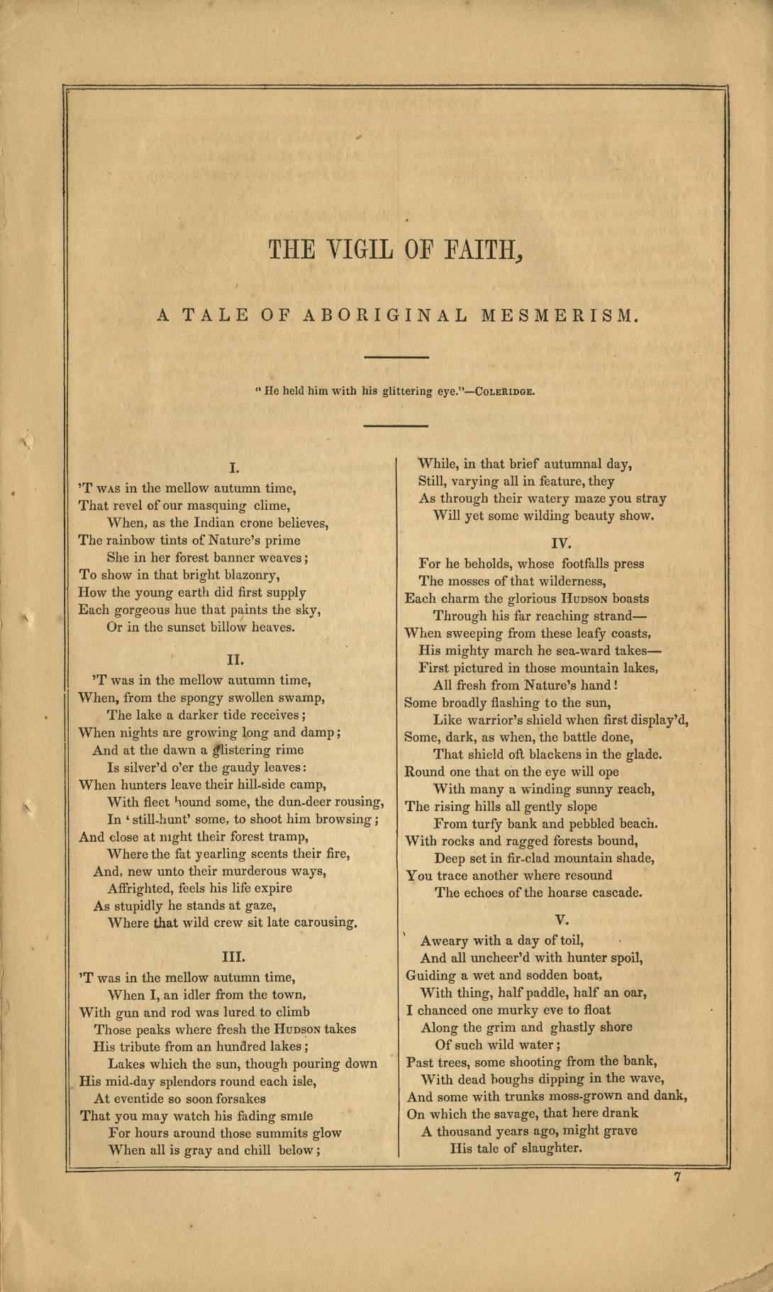 ---. Vigil of Faith and Other Poems. New York: S. Coleman, 1842. SPEC PS 1934 .V4 1842. (Kessinger Legacy facsimile reprint). The poem “Vigil of Faith” was the first poem I was able to locate that referred to the Adirondacks by name, and was therefore the only piece I could envision in the first case of my exhibition. A self-proclaimed “legend of the Adirondack mountains,” “Vigil of Faith” uses narrative to walk us through the Adirondacks and present us with the tranquil beauty found there.