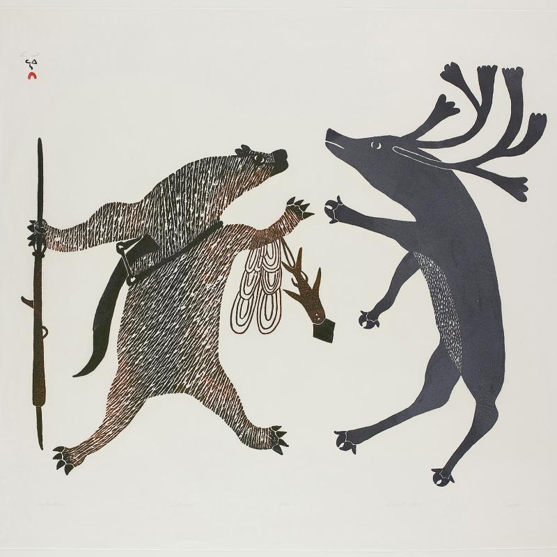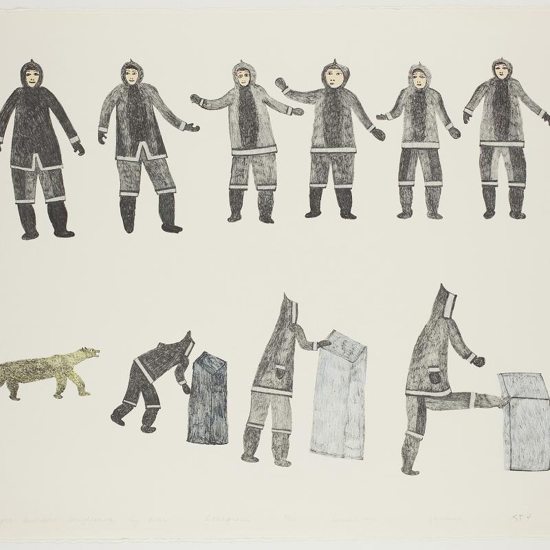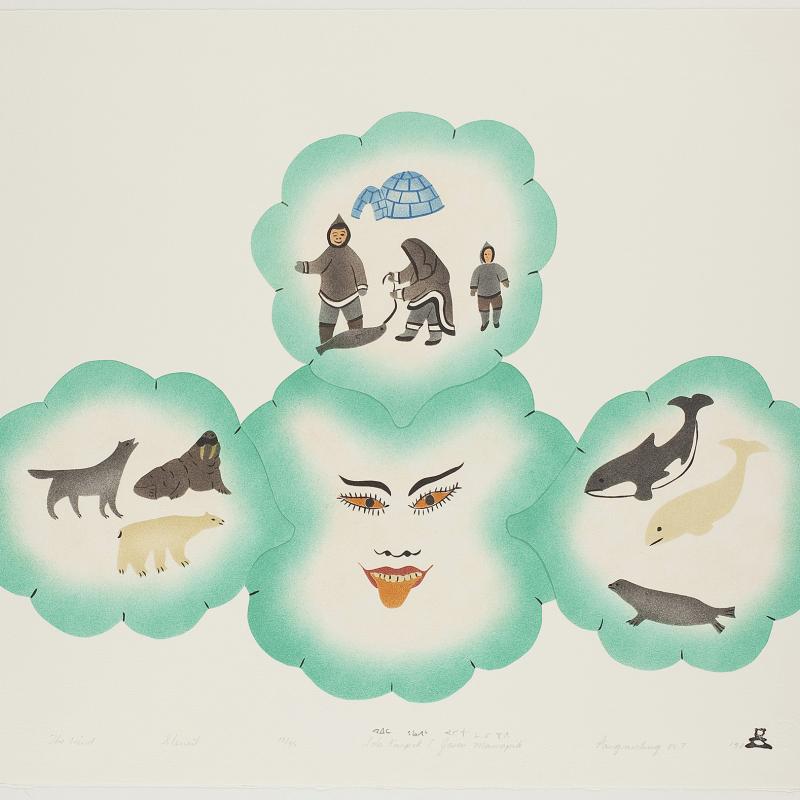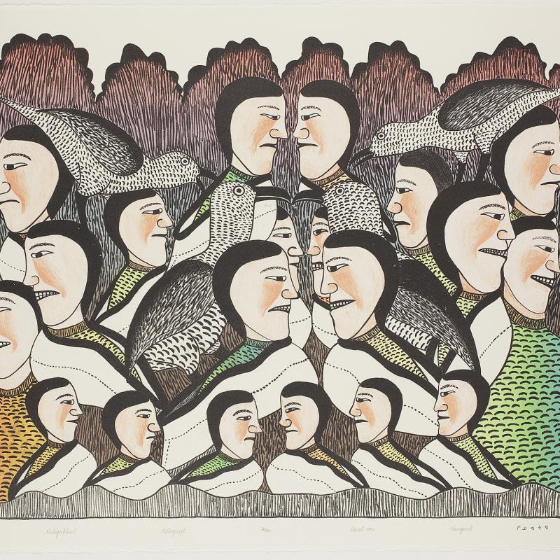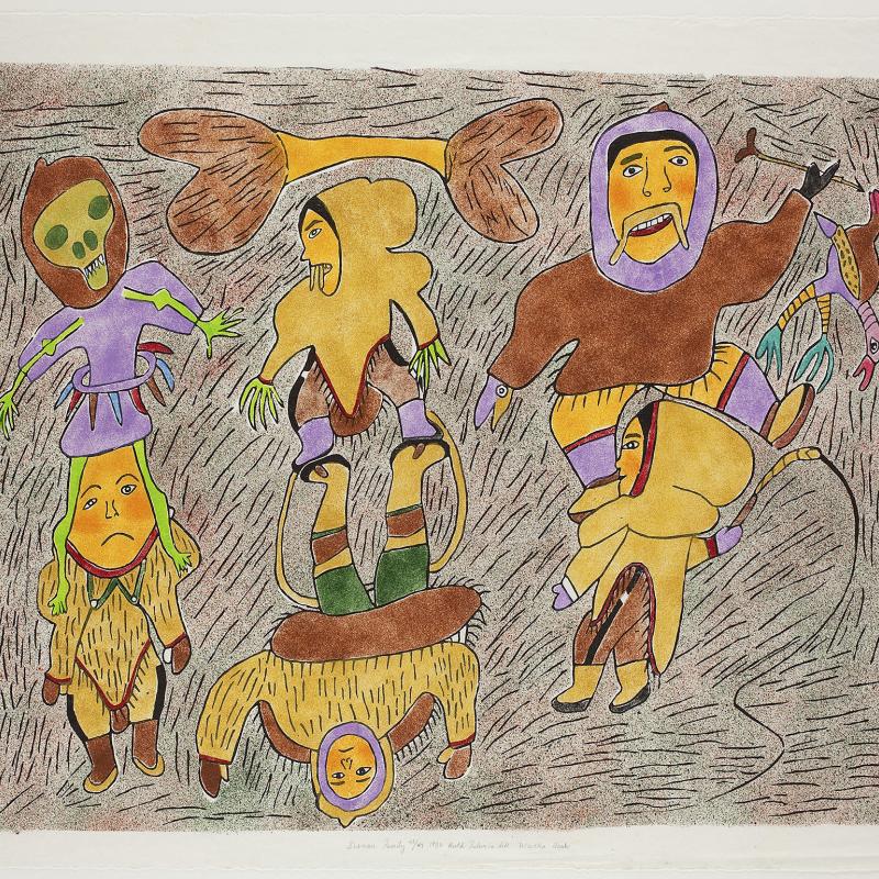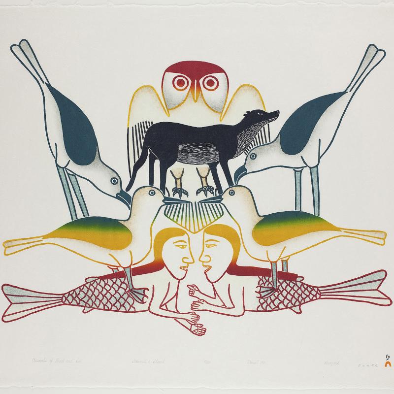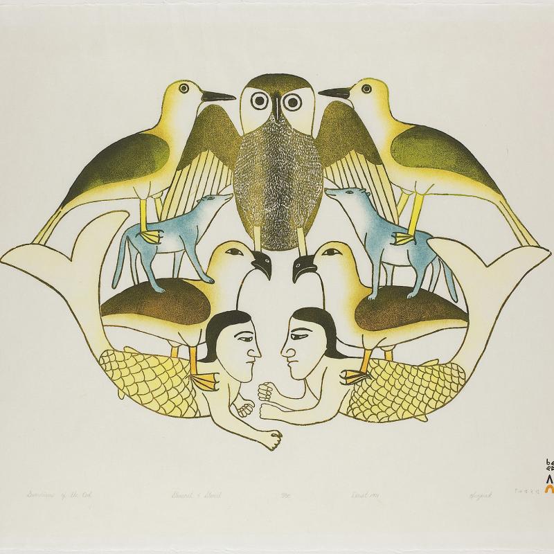 In 2005, an exhibition entitled Far North: Inuit Prints and Drawings from Cape Dorset focused on the work of artists from what is one of the most important and innovative centers of Inuit art. Recently, the gallery acquired the 2009 Cape Dorset print collection, which was released by Dorset Fine Arts to mark Kinngait Studio’s 50th anniversary. Nipirasait: Many Voices, an exhibition based on the 36 prints in the collection, premiered at the Canadian Embassy in Washington, D.C., in 2010, and was presented the following year at St. Lawrence University and the College of Wooster Art Museum in Wooster, Ohio. Another exhibition drawn from St. Lawrence University’s permanent collection, North of Sixty: Canadian Inuit Prints, was presented at the Huntington Museum of Art in West Virginia in 2014.
