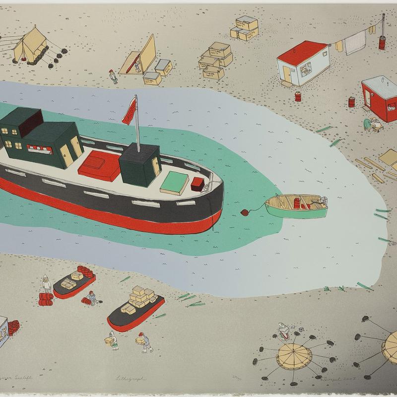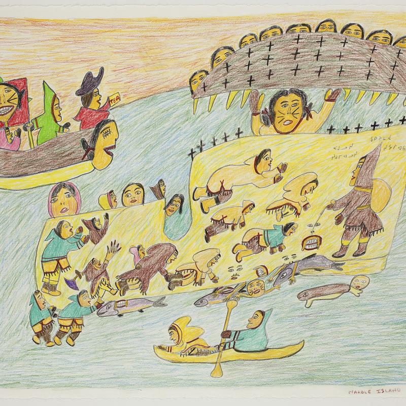 The Richard F. Brush Art Gallery has had a longstanding interest in Inuit art and has been actively acquiring works since the early 1990s. In 2001, as part of that year’s annual St. Lawrence University Festival of the Arts, the gallery presented From “Nanook” to Nunavut, which explored the representation of Inuit art and culture through an exhibition of prints by Jessie Oonark, drawings by Alootook Ipellie, and photographs by Alison Wright and Norman Hallendy. A faculty/student research trip to Baffin Island in 2000 provided the foundation for these exhibitions.