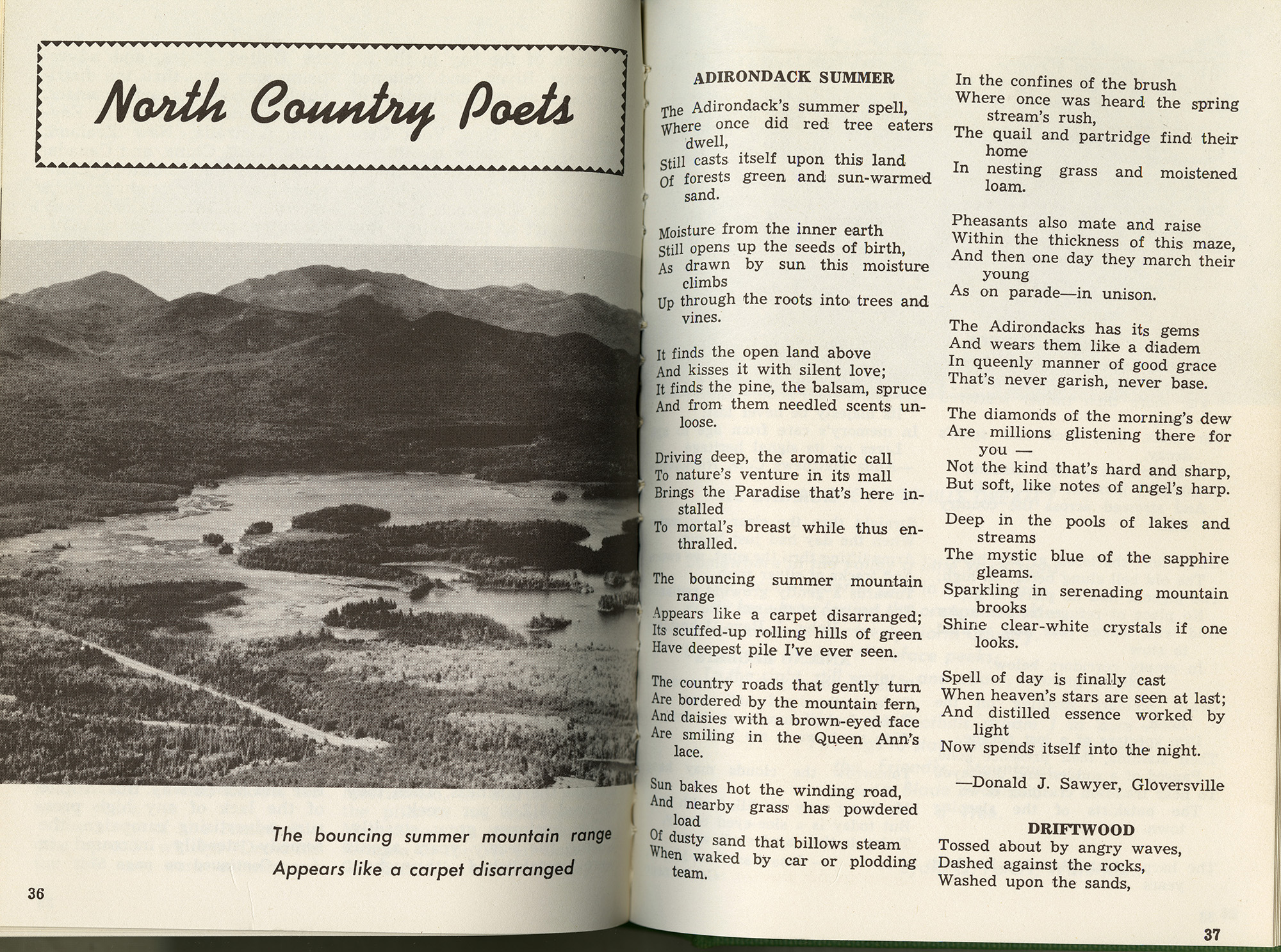 After World War II ended in 1945, literature about the Adirondacks became much more plentiful. These two cases highlight examples of the periodicals that published poems during the second half of the twentieth century: Cloud Splitter, Ad-i-ron-dac, High Spots, North Country Life and Trailmarker, These magazines featured, in addition to poetry, calendars of local recreational activities, commentary on current events, photographs, and essays on Adirondack history.