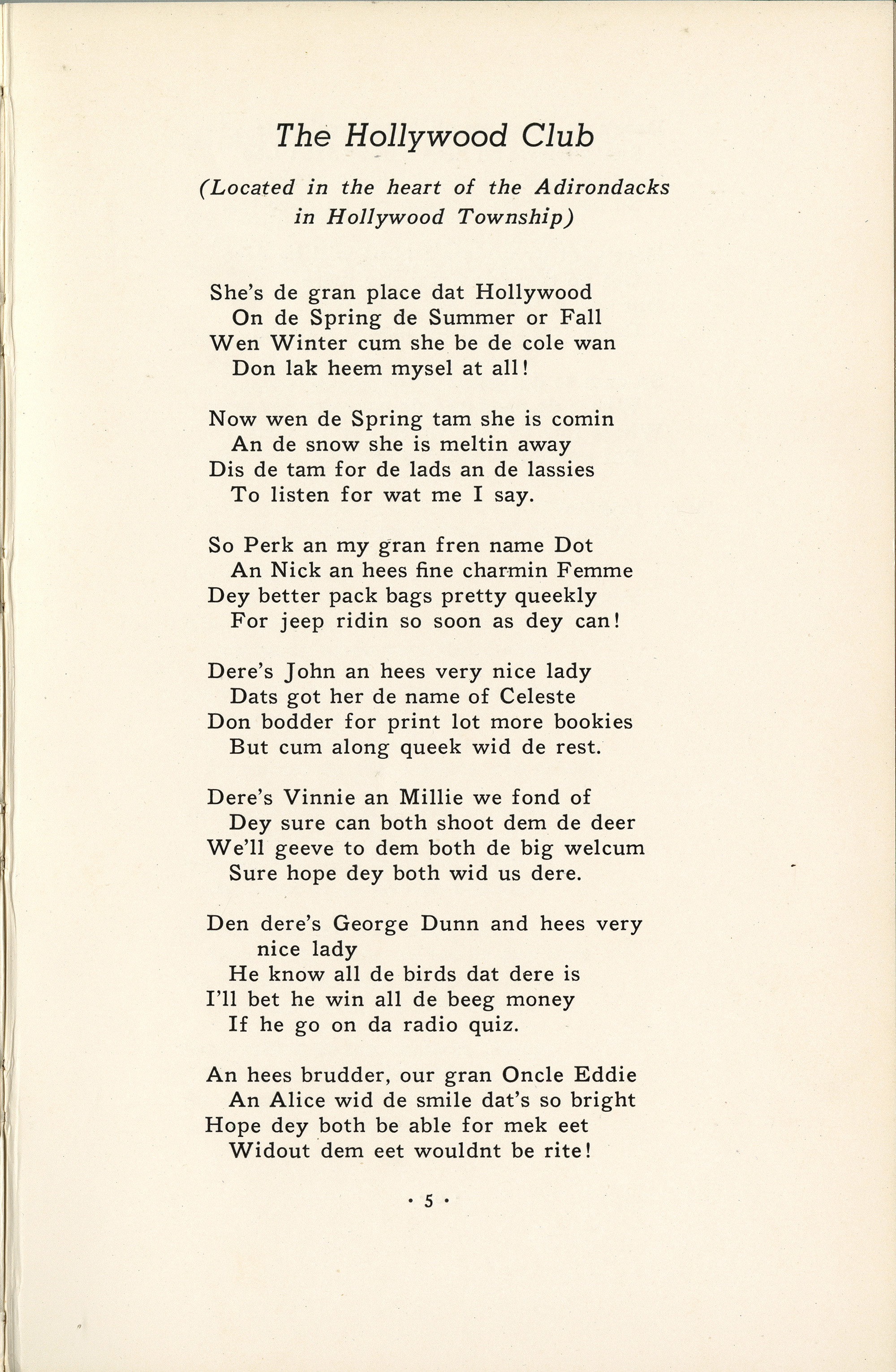 Throughout my survey of Adirondack poetry, I stumbled across multiple books that included pieces in the same style as “The Hollywood Club”. These poems are written in dialect, which not only serves to root the poem more firmly in the Adirondacks, but also to lighten the poem. The use of dialect here allows funny wrenched rhymes (such as “deer” and “dere”).