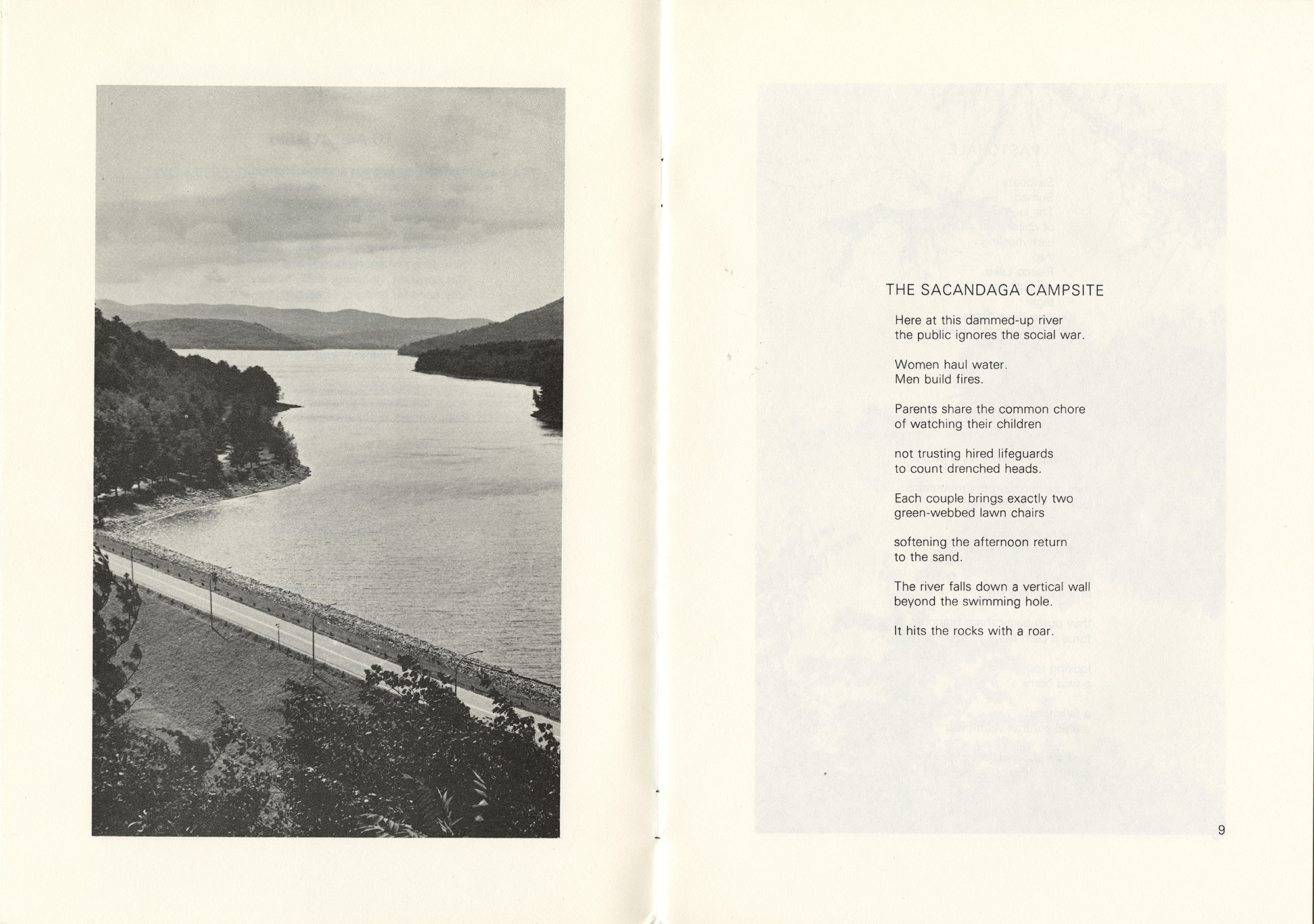 Joanne Seltzer’s Adirondack Lake Poems takes full advantage of two artistic mediums: poetry and photography (with photographs by Alan Cederstrom). I chose this page in particular because I thought that the comparison between the “dammed-up river” and the ignorance of the “social war” was worth noting. I feel that the strongest poems not only describe the Adirondacks, but also use their description to represent something more than what is physically there. The metaphor in “The Scanandaga Campsite” becomes most apparent in the last few lines, with the description of the impending waterfall becoming a reference to human disregard of future dangers due to short-term thinking and comforts.