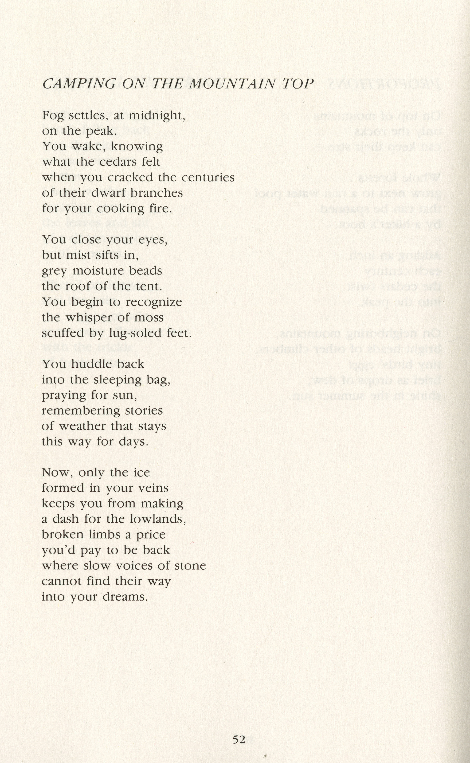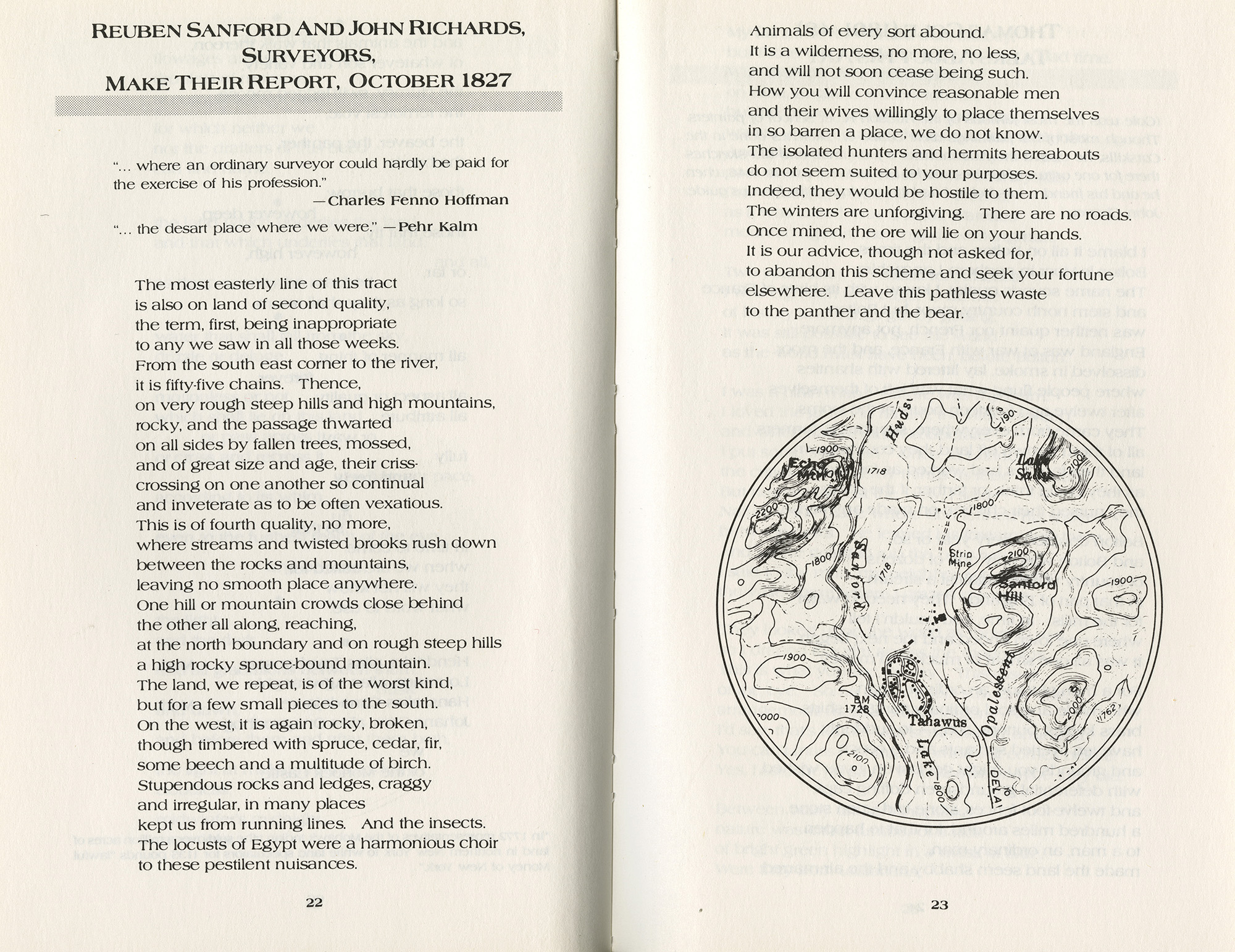 Out of an entire book of poetry by Roger Mitchell named Adirondack, I chose to display this poem in particular because I thought his use of an historical event to describe the Adirondack wilderness was something I had not previously seen. The poem itself is funny in that the surveyor’s report makes the Adirondacks sound like such an uninhabitable wasteland, but as most who have found themselves here know, that is not the case.