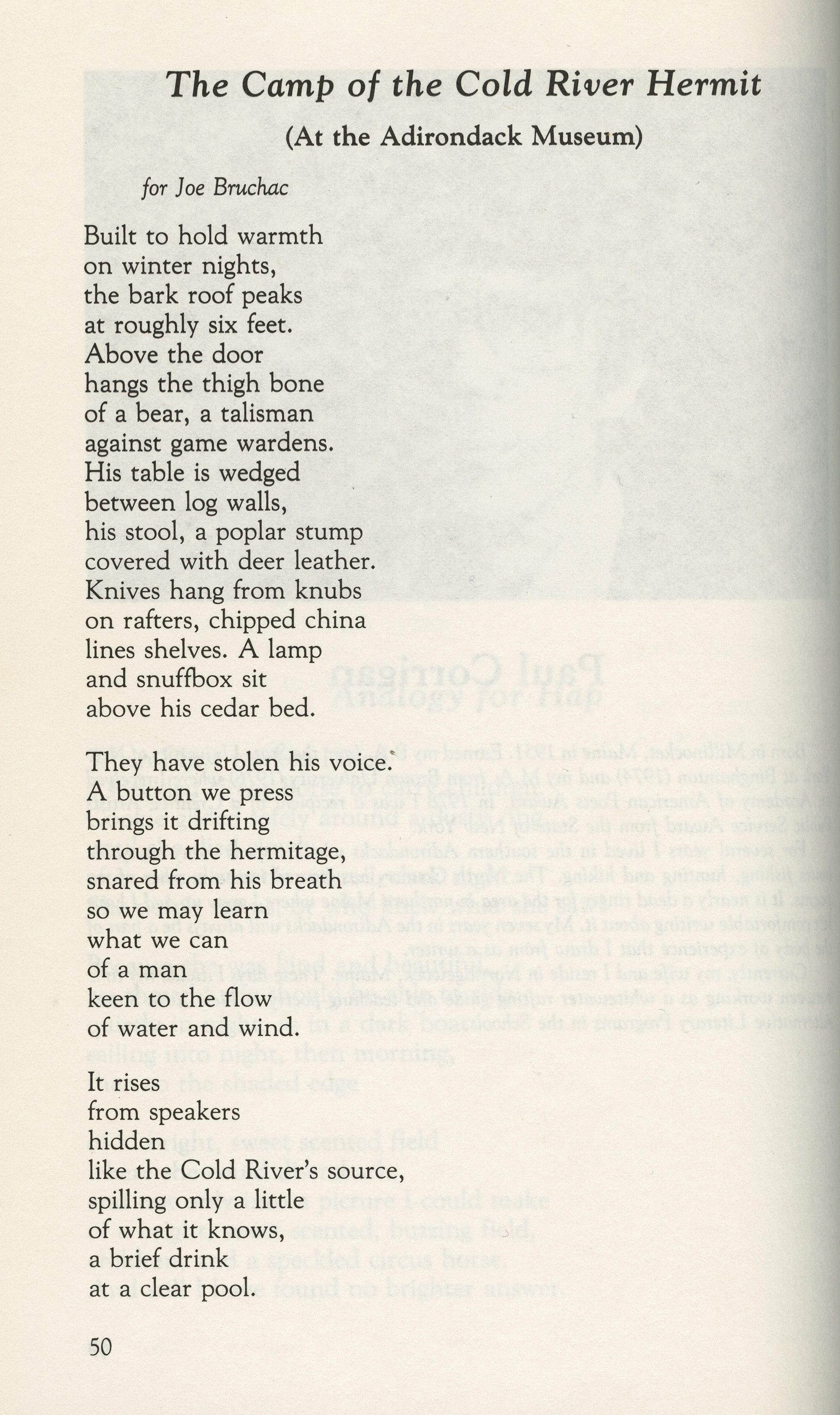 Bruchac, Joseph, and Joe David Bellamy. North Country: An Anthology of Contemporary Writing from the Adirondacks and the Upper Hudson Valley. 1st ed. Greenfield Center, N.Y.: The Greenfield Review Press, 1986. SPEC PS548 .N7 N67 1986 c. 2.