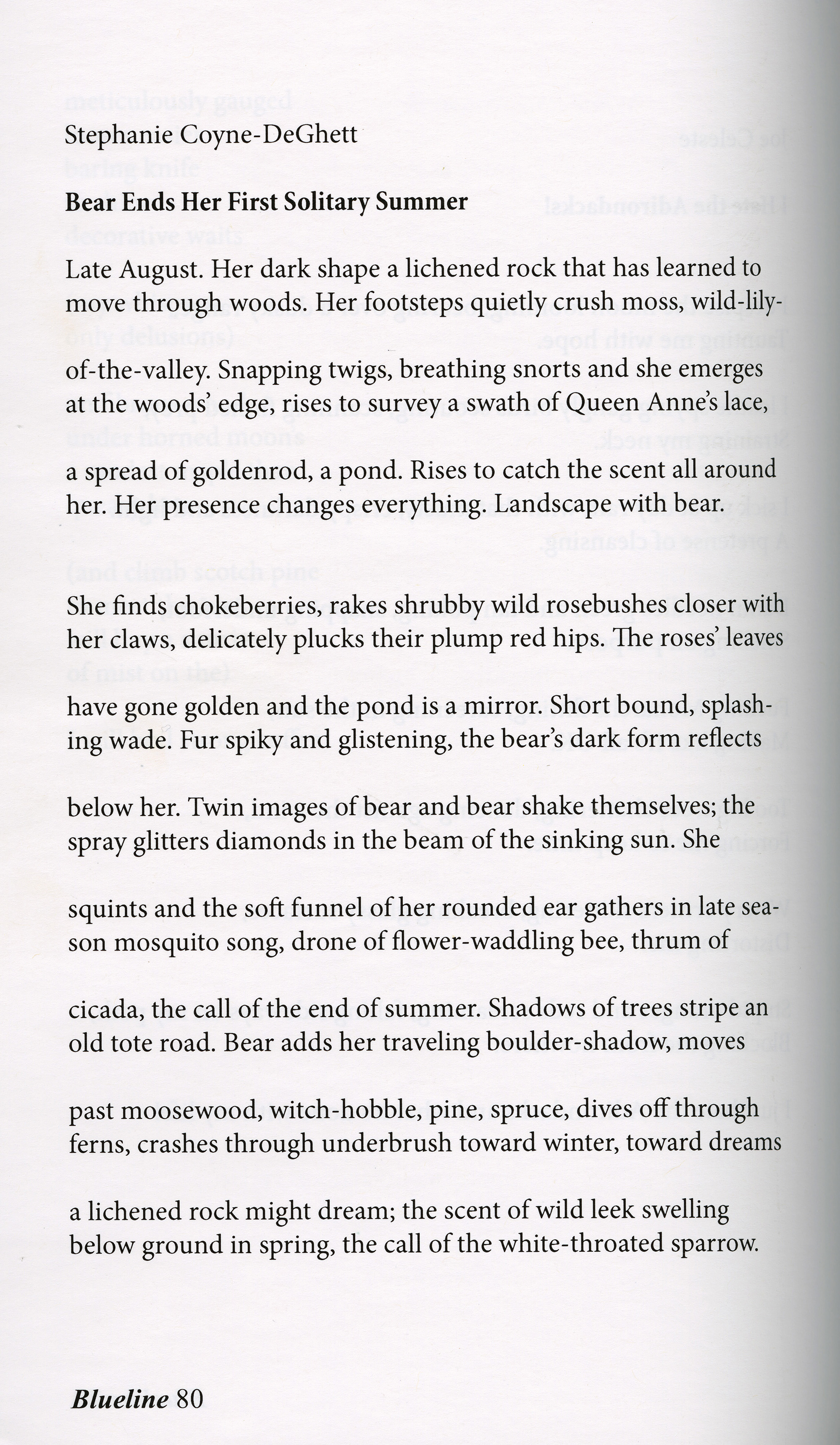 “Bear Ends her first Solitary Summer” from the most recent installment of Blueline was included in a section titled “Adirondack Ikons” edited by Adirondack poet Maurice Kenny (highlighted in a main lobby case). This poem stood out in particular because there are not too many other poems that are able to focus entirely on an animal and still comment on the human experience. The speaker does not need to relate the bear back to herself because her close attention to detail says it all: the speaker does not belong in this moment, it is “Landscape with bear”.