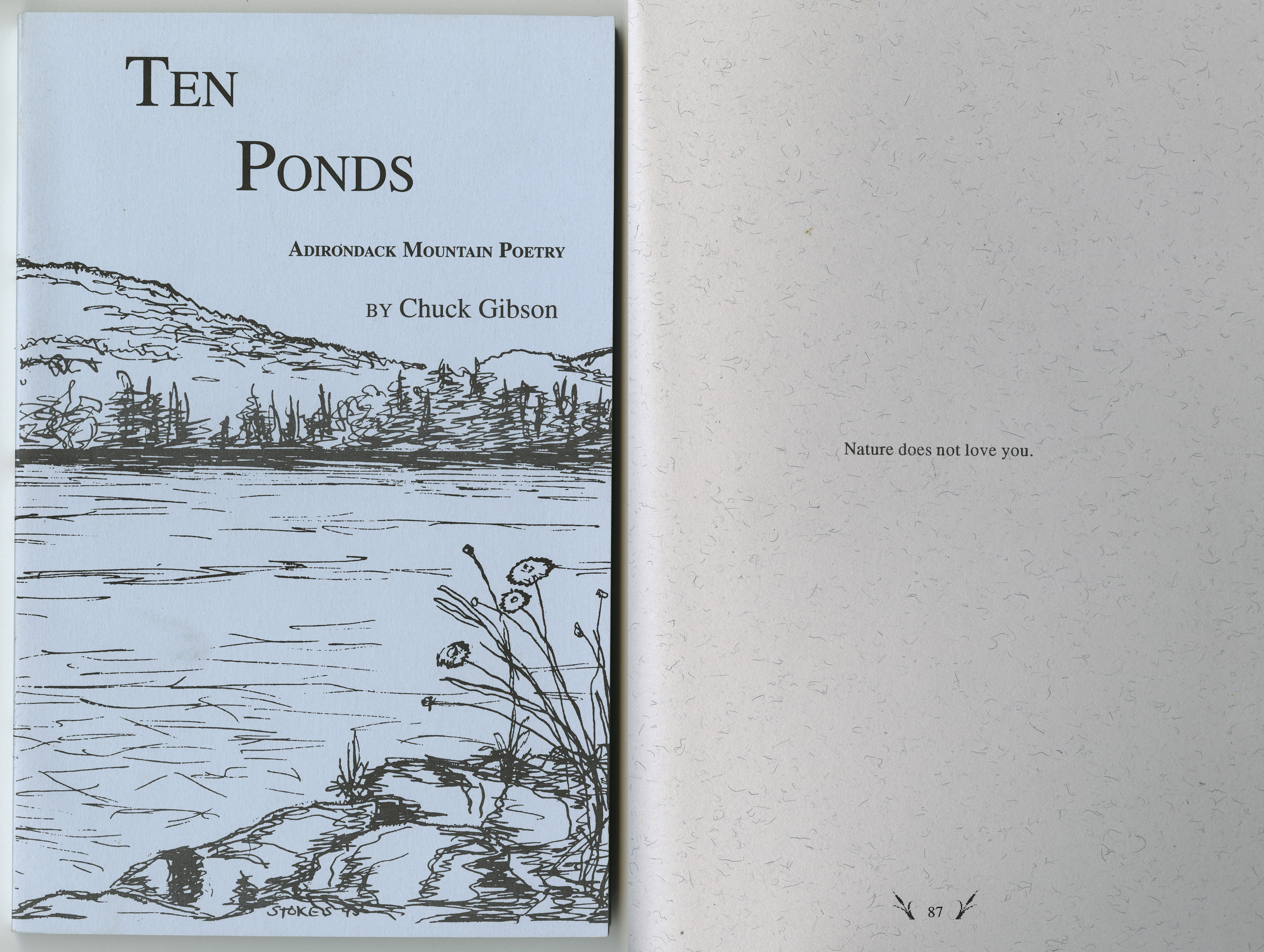 This page from Chuck Gibson’s Ten Ponds serves to sum up a lot of what the poems on display have already been trying to say: “nature does not love you”.