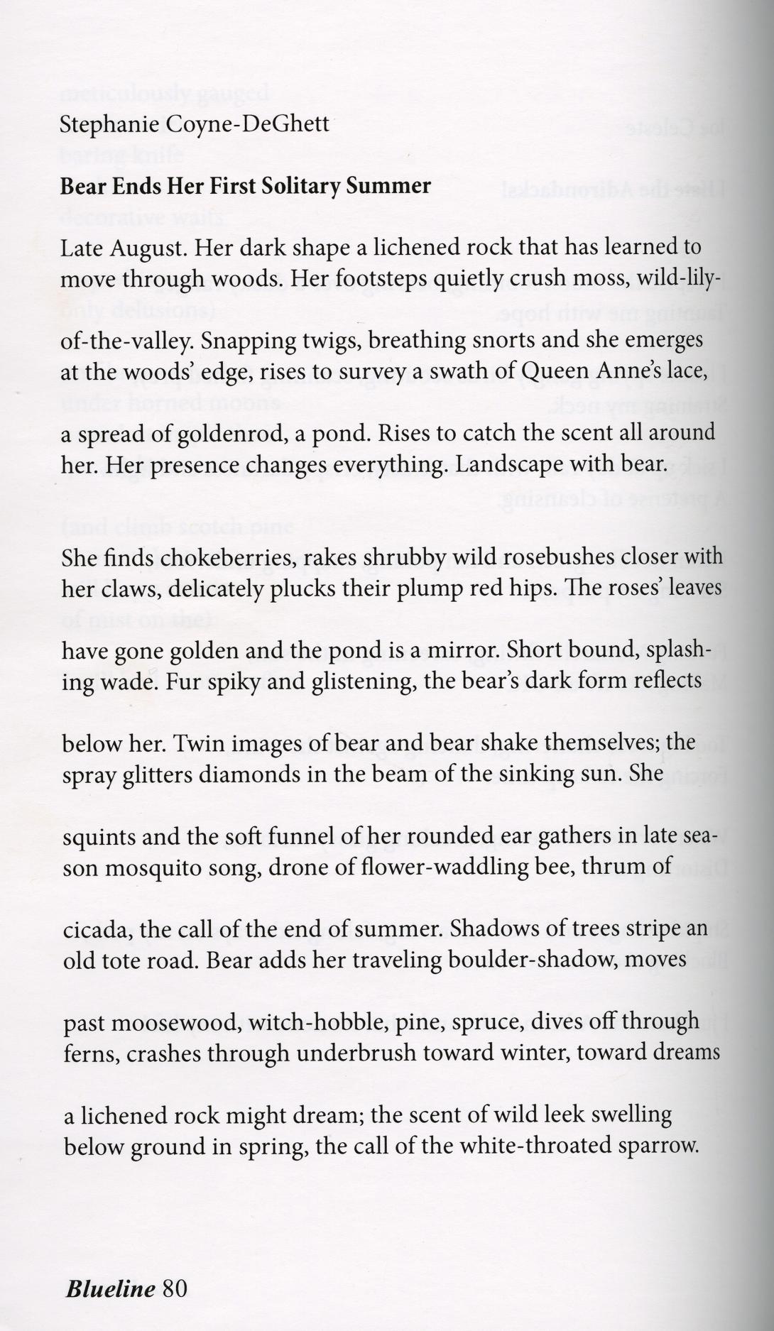Coyne-DeGhett, Stephanie. "Bear Ends Her First Solitary Summer." Blueline 34 (2013): 80. SPEC F127.A2 B58.