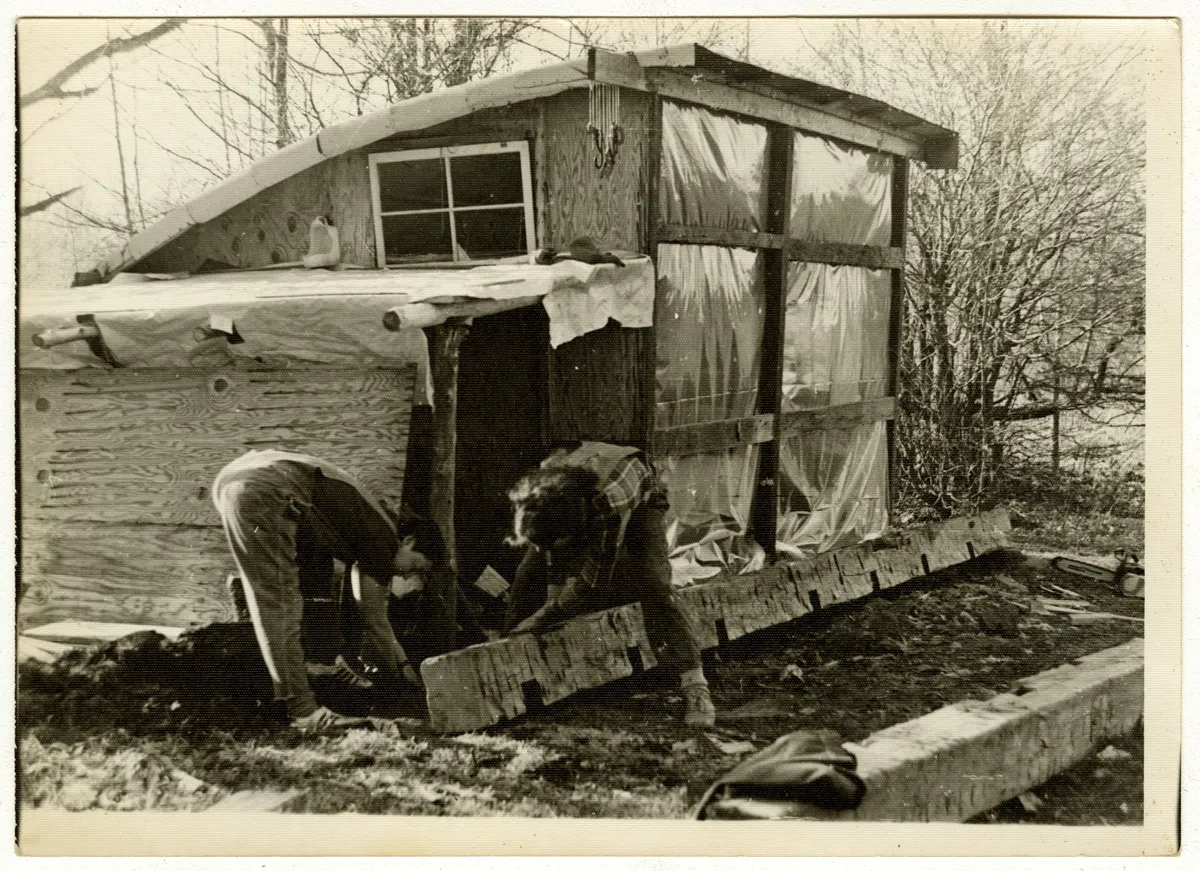 Explore this collection tractors flowers sense of place history harvest porches mulch fences poetry cover crops green manure organic farming biographical trees tomatoes buildings spinach advertising farming group photograph energy folklife lettuce garlic architecture season extension activism building gatherings Overview Creator: Jones, Doug Subject: DwellingsHouse constructionBirdsfoot Farm Description:Valerie Summer and Alan Sorotkin enlarging the "Far House" at Birdsfoot Farm, circa 1978 Source:Original version: photograph, b&w; 5 x 7 in. Rights Rights Management:Original materials may be protected by the Copyright Law of the United States (more information). Resource Identifier:Private Collection Contributor:Birdsfoot Farm Relation:Back to the Land Technical Digitization Specifications:Scanned at 600ppi on Epson 1000XL scanner as 48-bit RGB uncompressed TIFF images. Images resized to 960 pixels wide, 150 dpi, and saved as JPEG (level 7) in Photoshop CS4 with Unsharp Mask of 60:1. Date Digital:Mon, 01/25/2010 - 20:00 Format:image/jpeg Type:Image