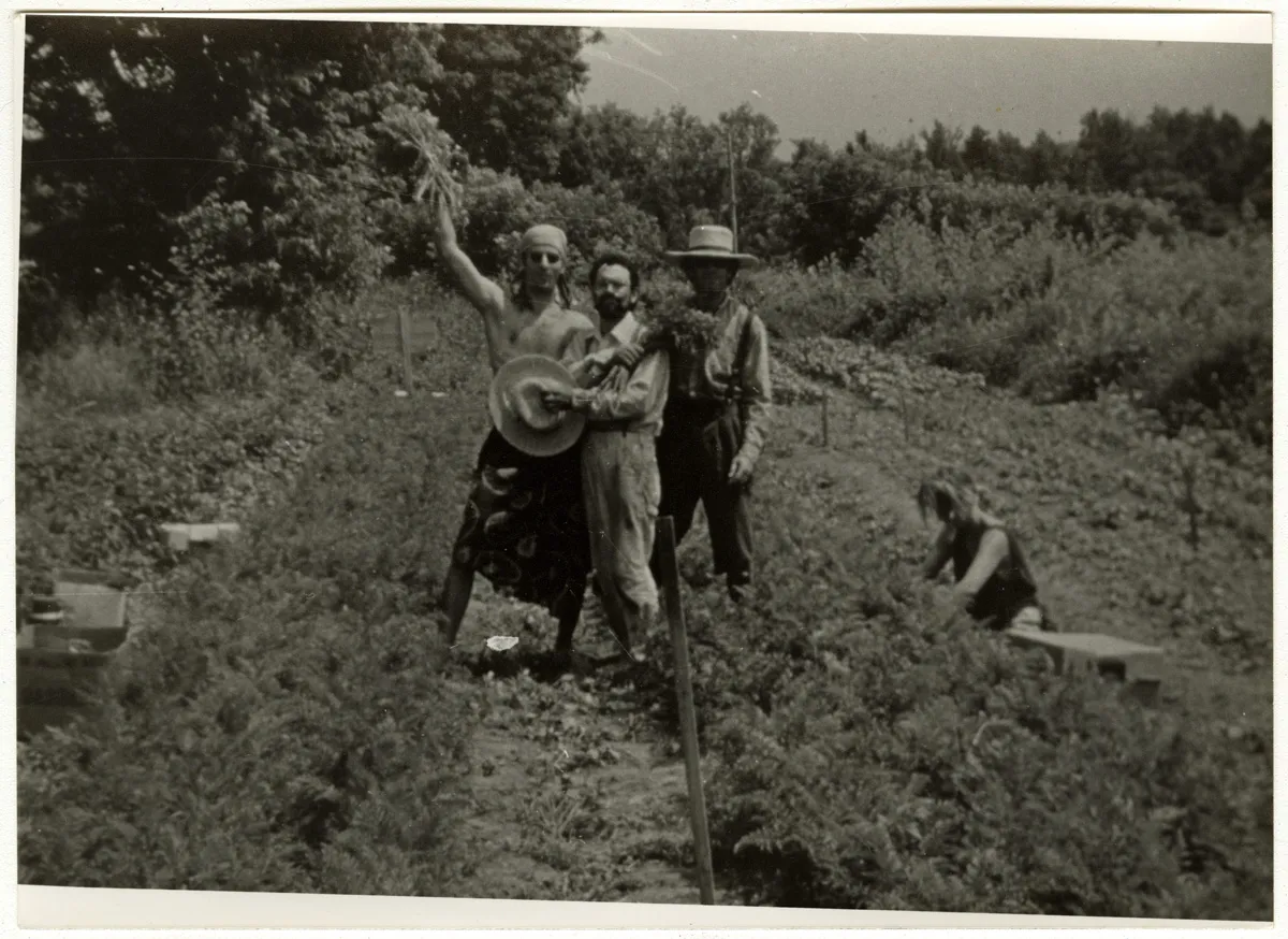 Explore this collection farming poetry cover crops buildings flowers sense of place activism harvest building spinach energy tomatoes lettuce porches folklife mulch season extension fences architecture organic farming group photograph tractors gatherings green manure trees history garlic advertising biographical Overview Creator: Jones, Doug Subject: Organic farmingSustainable agricultureBirdsfoot FarmGardensOrganic GardeningVegetable gardeningFarm life Description:unknown male on left, Fred Saburro, Jim Cohen and unidentified woman kneeling. Source:Original version: photograph, b&w; 5 x 7 in. Rights Rights Management:Original materials may be protected by the Copyright Law of the United States (more information). Resource Identifier:Private Collection Contributor:Birdsfoot Farm Relation:Back to the Land Technical Digitization Specifications:Scanned with Nikon Super CoolScan 9000 ED scanner as uncompressed TIFF images. Images resized to 1200 pixels wide, 150 dpi, and saved as JPEG (level 7) in Photoshop CS4 with Unsharp Mask of 60:1. Date Digital:Mon, 01/25/2010 - 20:00 Format:image/jpeg Type:Image