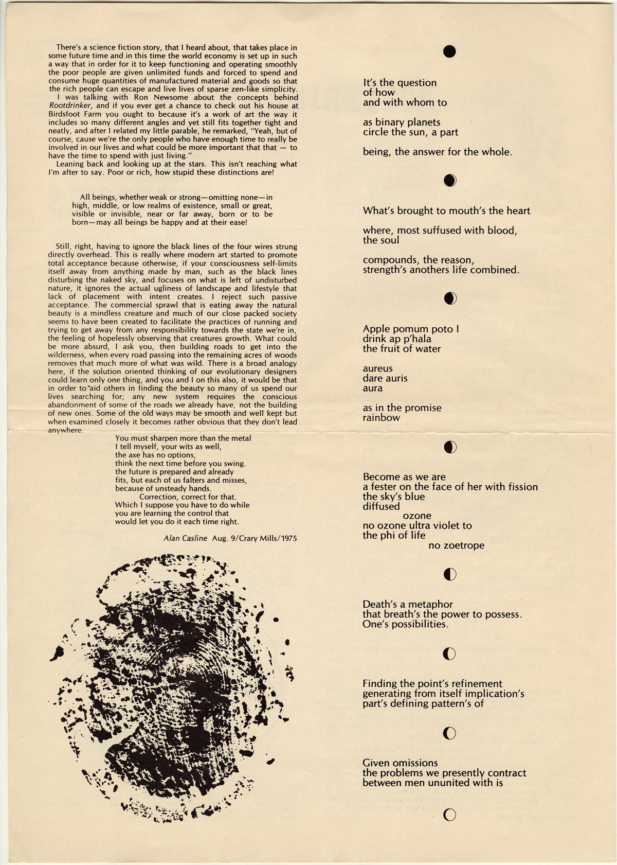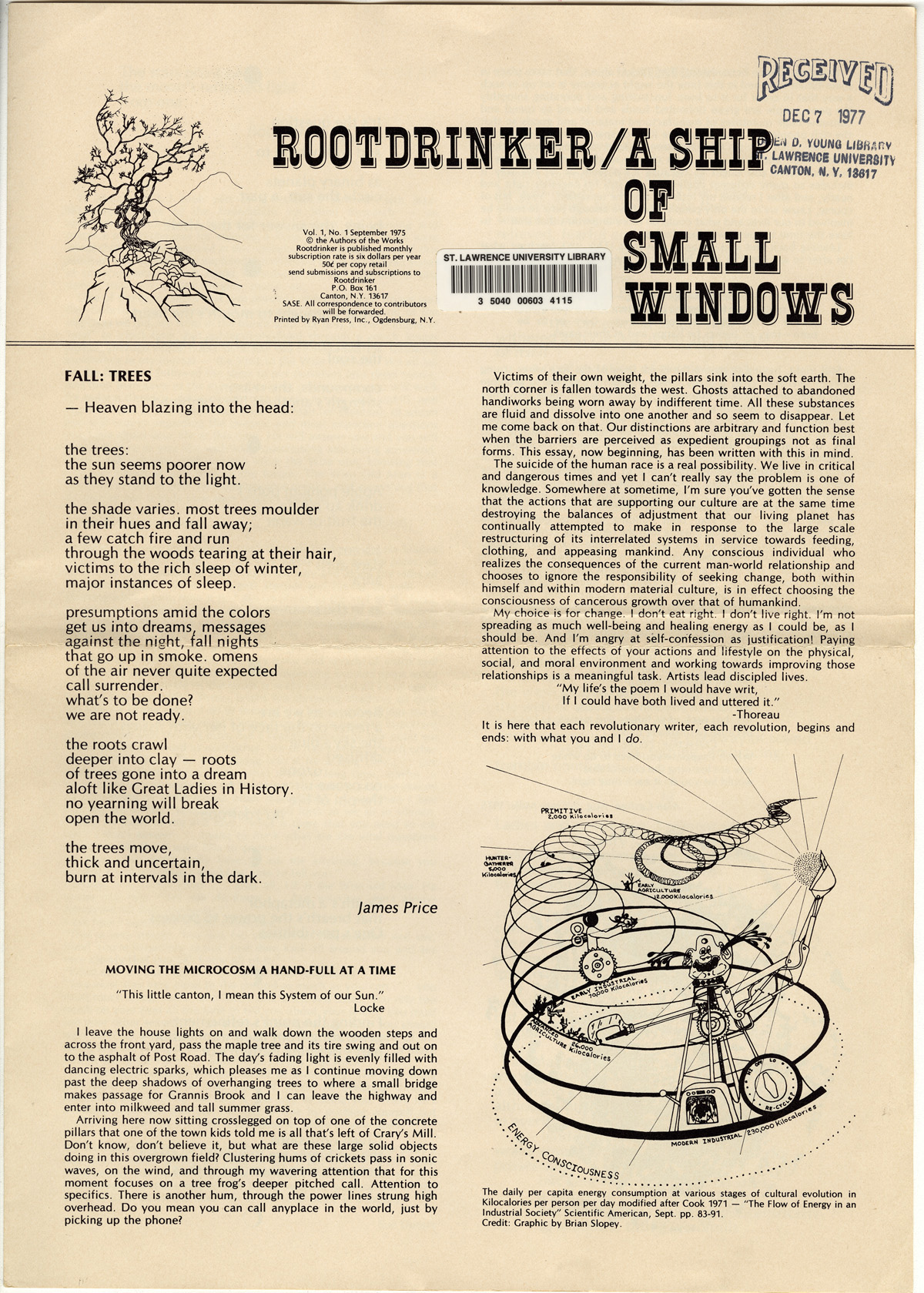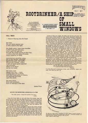 PDF:rootdrinker_v1_n1_1975-1-2.pdf(1.62 MB) Overview Issue:Rootdrinker: A Ship of Small Windows; Volume 1, Number 1, September 1975 Bibliographic Citation:Rootdrinker 1.1 (1975): 1-2. Journal Title:Rootdrinker Creator: Casline, Alan Subject: Source:Original format: Published in Rootdrinker, volume 1, number 1, 1975. ODY Special Collections F127.S23 R66 Language:eng Start Page 1 Relation:Back to the Land Rights Rights Management:Original materials may be protected by the Copyright Law of the United States (more information). Resource Identifier:ODY Special Collections F127.S23 R66 Technical Digitization Specifications:Scanned at 600ppi on Epson 1000XL scanner as 48-bit RGB uncompressed TIFF images. Images resized to 960 pixels wide, 150 dpi, and saved as JPEG (level 7) in Photoshop CS4 with Unsharp Mask of 60:1. Date Digital:January 4, 2010 - 20:00 Format:text/html Type:Text