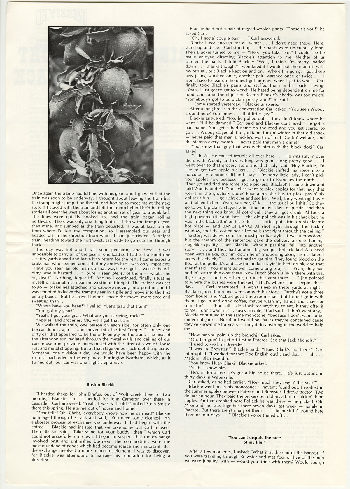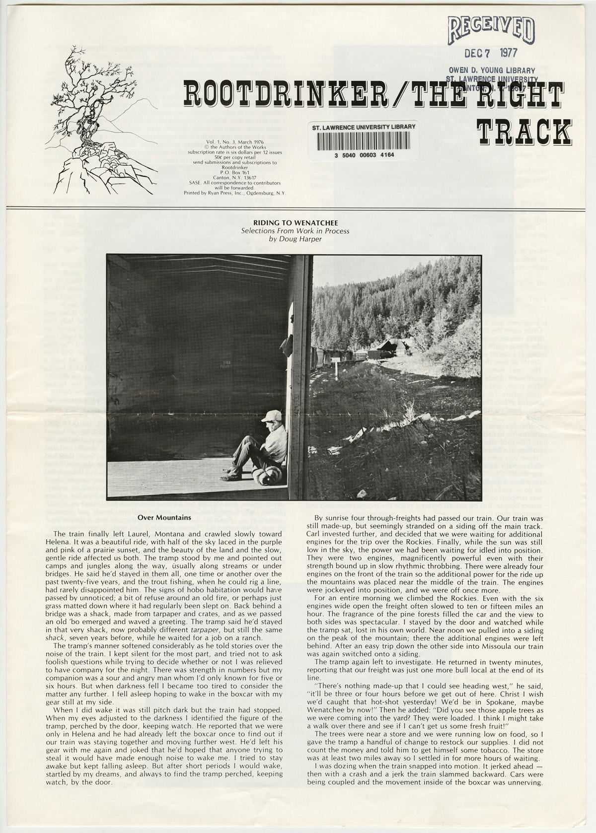 PDF:rootdrinker_volume1_no3_1976.pdf(3.89 MB) Overview Issue:Rootdrinker: The Right Track; Volume 1, Number 3, March 1976 Bibliographic Citation:Harper, Doug. "Riding to Wenatchee: Selections from Work in Process." Rootdrinker 1.3 (1976): 1-4. Journal Title:Rootdrinker Creator: Harper, Doug Subject: Source:Original format: Published in Rootdrinker, volume 1, number 3, 1976. ODY Special Collections F127.S23 R66 Language:eng Start Page 1 Relation:Back to the Land Rights Rights Management:Original materials may be protected by the Copyright Law of the United States (more information). Resource Identifier:ODY Special Collections F127.S23 R66 Technical Digitization Specifications:Scanned at 600ppi on Epson 1000XL scanner as 48-bit RGB uncompressed TIFF images. Images resized to 960 pixels wide, 150 dpi, and saved as JPEG (level 7) in Photoshop CS4 with Unsharp Mask of 60:1. Date Digital:January 5, 2010 - 20:00 Format:text/html Type:Text