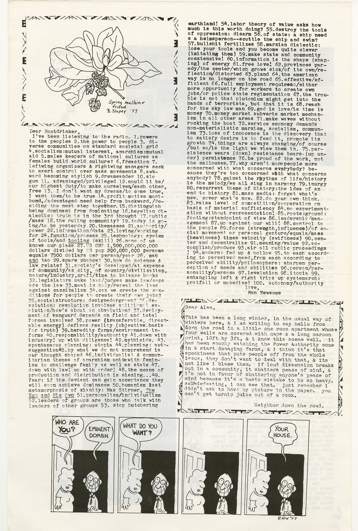 PDF:rootdrinker_n5_1977-5.pdf(1.2 MB) Overview Issue:Rootdrinker: A Journal of the St. Lawrence Border Country; Volume 2, Number 5, Spring Equinox 1977 Bibliographic Citation:Newsome, Ron. Letter. Rootdrinker 2.5 (1977): 5. Journal Title:Rootdrinker Creator: Newsome, Ron Subject: Source:Original format: Published in Rootdrinker, volume 2, number 5, 1977. ODY Special Collections F127.S23 R66 Language:eng Start Page 5 Relation:Back to the Land Rights Rights Management:Original materials may be protected by the Copyright Law of the United States (more information). Resource Identifier:ODY Special Collections F127.S23 R66 Technical Digitization Specifications:Scanned at 600ppi on Epson 1000XL scanner as 48-bit RGB uncompressed TIFF images. Images resized to 960 pixels wide, 150 dpi, and saved as JPEG (level 7) in Photoshop CS4 with Unsharp Mask of 60:1. Date Digital:January 7, 2010 - 20:00 Format:text/html Type:Text
