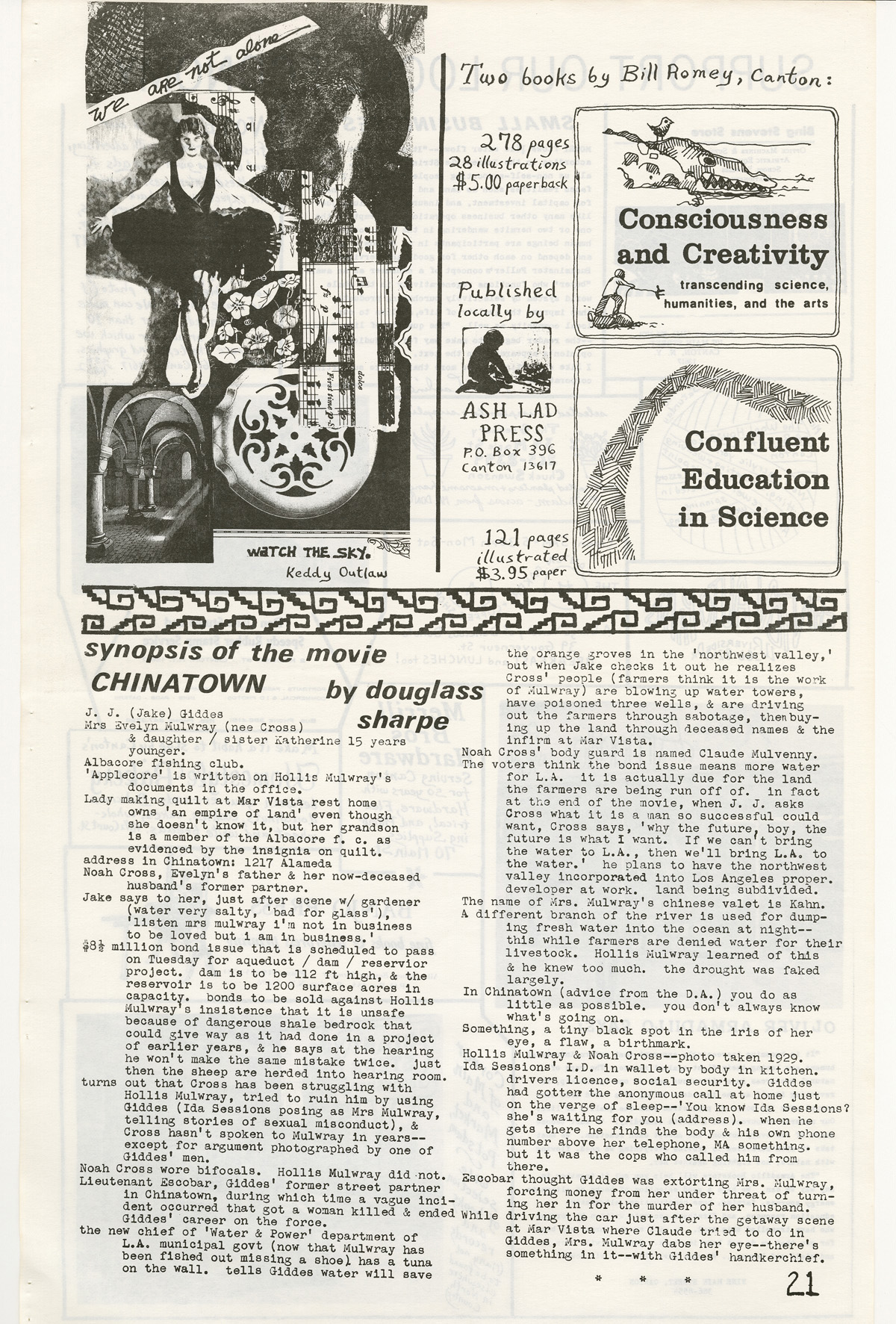 PDF:rootdrinker_n5_1977-21.pdf(1.18 MB) Overview Issue:Rootdrinker: A Journal of the St. Lawrence Border Country; Volume 2, Number 5, Spring Equinox 1977 Bibliographic Citation:Sharpe, Douglass. "Synopsis of the Movie Chinatown." Rootdrinker 2.5 (1977): 21. Journal Title:Rootdrinker Creator: Sharpe, Douglass Subject: Source:Original format: Published in Rootdrinker, volume 2, number 5, 1977. ODY Special Collections F127.S23 R66 Language:eng Start Page 21 Relation:Back to the Land Rights Rights Management:Original materials may be protected by the Copyright Law of the United States (more information). Resource Identifier:ODY Special Collections F127.S23 R66 Technical Digitization Specifications:Scanned at 600ppi on Epson 1000XL scanner as 48-bit RGB uncompressed TIFF images. Images resized to 960 pixels wide, 150 dpi, and saved as JPEG (level 7) in Photoshop CS4 with Unsharp Mask of 60:1. Date Digital:January 9, 2010 - 20:00 Format:text/html Type:Text