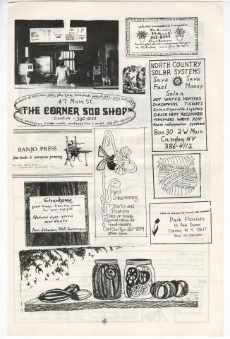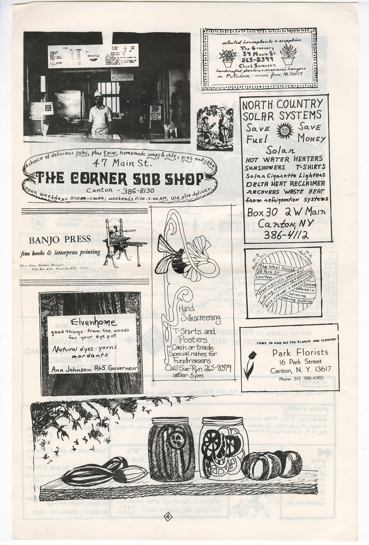 PDF:rootdrinker_v2_n6_1977-4.pdf(916.16 KB) Overview Issue:Rootdrinker: A Journal of the St. Lawrence Border Country; Volume 2, Number 6, Summer Solstice 1977 Bibliographic Citation:Rootdrinker 2.6 (1977): 4. Journal Title:Rootdrinker Creator: Subject: Source:Original format: Published in Rootdrinker, volume 2, number 6, 1977. ODY Special Collections F127.S23 R66 Language:eng Start Page 4 Relation:Back to the Land Rights Rights Management:Original materials may be protected by the Copyright Law of the United States (more information). Resource Identifier:ODY Special Collections F127.S23 R66 Technical Digitization Specifications:Scanned at 600ppi on Epson 1000XL scanner as 48-bit RGB uncompressed TIFF images. Images resized to 1200 pixels wide, 150 dpi, and saved as JPEG (level 7) in Photoshop CS4 with Unsharp Mask of 60:1. Date Digital:January 10, 2010 - 20:00 Format:text/html Type:Text