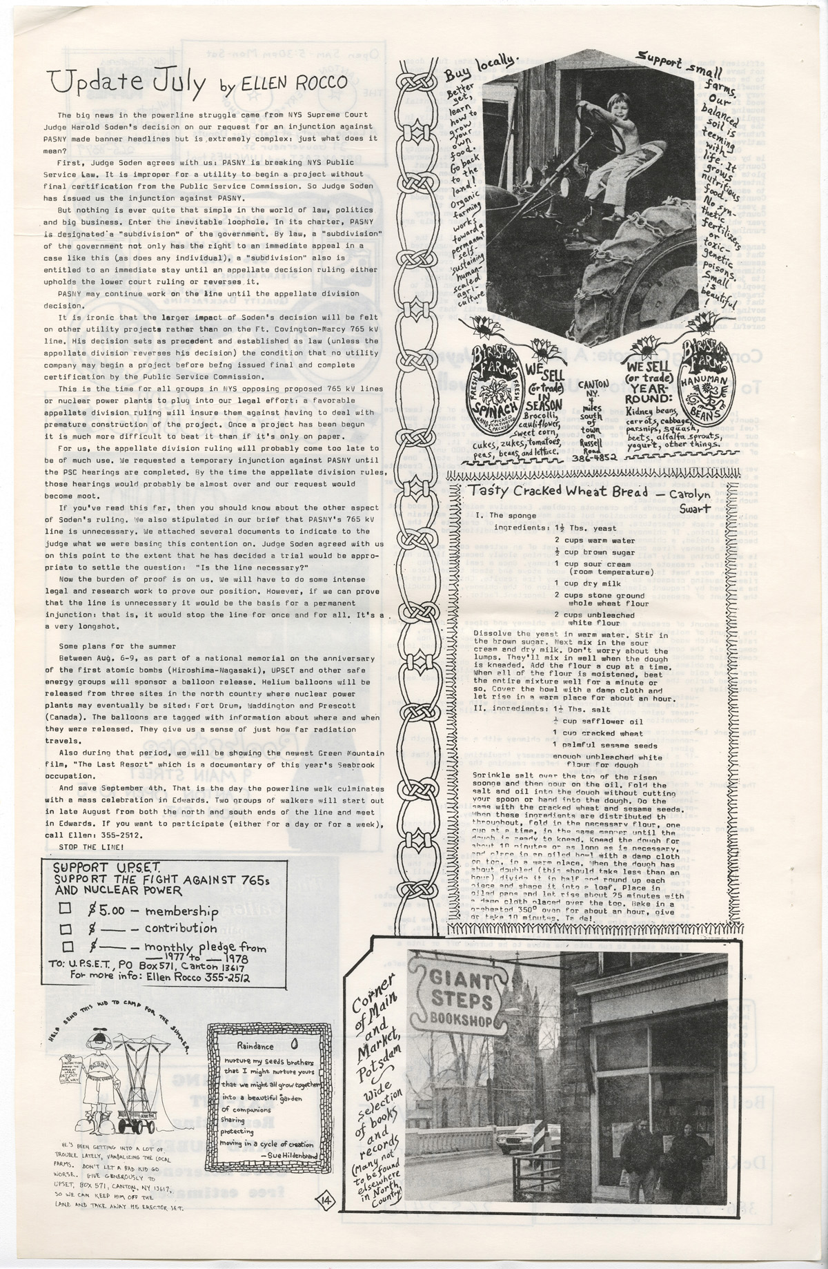PDF:rootdrinker_v2_n6_1977-14.pdf(1.12 MB) Overview Issue:Rootdrinker: A Journal of the St. Lawrence Border Country; Volume 2, Number 6, Summer Solstice 1977 Bibliographic Citation:Rocco, Ellen. "Update July." Rootdrinker 2.6 (1977): 14. Journal Title:Rootdrinker Creator: Rocco, Ellen Subject: Source:Original format: Published in Rootdrinker, volume 2, number 6, 1977. ODY Special Collections F127.S23 R66 Language:eng Start Page 14 Relation:Back to the Land Rights Rights Management:Original materials may be protected by the Copyright Law of the United States (more information). Resource Identifier:ODY Special Collections F127.S23 R66 Technical Digitization Specifications:Scanned at 600ppi on Epson 1000XL scanner as 48-bit RGB uncompressed TIFF images. Images resized to 1200 pixels wide, 150 dpi, and saved as JPEG (level 7) in Photoshop CS4 with Unsharp Mask of 60:1. Date Digital:January 10, 2010 - 20:00 Format:text/html Type:Text