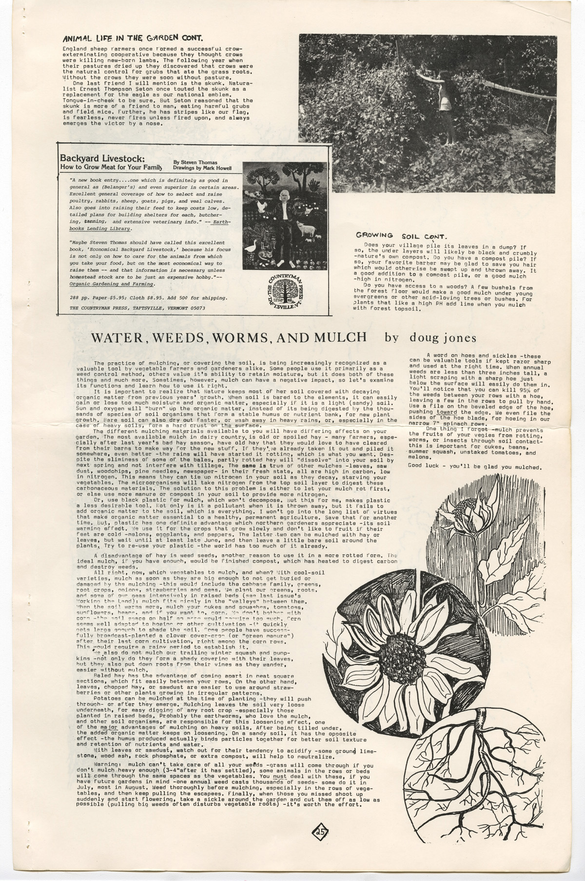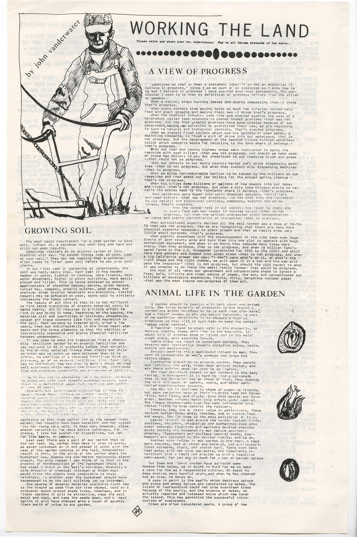 PDF:rootdrinker_v2_n6_1977-24-25.pdf(2.3 MB) Overview Issue:Rootdrinker: A Journal of the St. Lawrence Border Country; Volume 2, Number 6, Summer Solstice 1977 Bibliographic Citation:Van de Water, John. "Working the Land: A View of Progress." Rootdrinker 2.6 (1977): 24-25. Journal Title:Rootdrinker Creator: Van de Water, John Subject: Source:Original format: Published in Rootdrinker, volume 2, number 6, 1977. ODY Special Collections F127.S23 R66 Language:eng Start Page 24 Relation:Back to the Land Rights Rights Management:Original materials may be protected by the Copyright Law of the United States (more information). Resource Identifier:ODY Special Collections F127.S23 R66 Technical Digitization Specifications:Scanned at 600ppi on Epson 1000XL scanner as 48-bit RGB uncompressed TIFF images. Images resized to 1200 pixels wide, 150 dpi, and saved as JPEG (level 7) in Photoshop CS4 with Unsharp Mask of 60:1. Date Digital:January 11, 2010 - 20:00 Format:text/html Type:Text