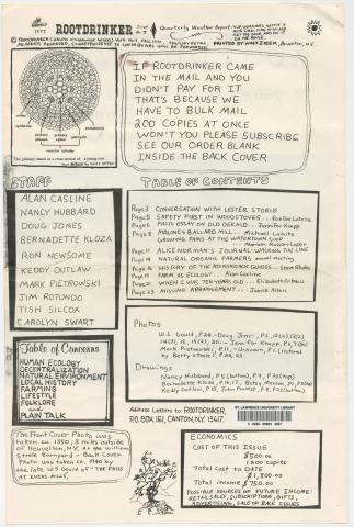 PDF:rootdrinker_v2_n7_1977-2.pdf(844.26 KB) Overview Issue:Rootdrinker: A Journal of the St. Lawrence Border Country; Volume 2, Number 7, Harvest 1977 Bibliographic Citation:Rootdrinker 2.7 (1977): 2. Journal Title:Rootdrinker Creator: Subject: Source:Original format: Published in Rootdrinker, volume 2, number 7, 1977. ODY Special Collections F127.S23 R66 Language:eng Start Page 2 Relation:Back to the Land Rights Rights Management:Original materials may be protected by the Copyright Law of the United States (more information). Resource Identifier:ODY Special Collections F127.S23 R66 Technical Digitization Specifications:Scanned at 600ppi on Epson 1000XL scanner as 48-bit RGB uncompressed TIFF images. Images resized to 1200 pixels wide, 150 dpi, and saved as JPEG (level 7) in Photoshop CS4 with Unsharp Mask of 60:1. Date Digital:January 14, 2010 - 20:00 Format:text/html Type:Text