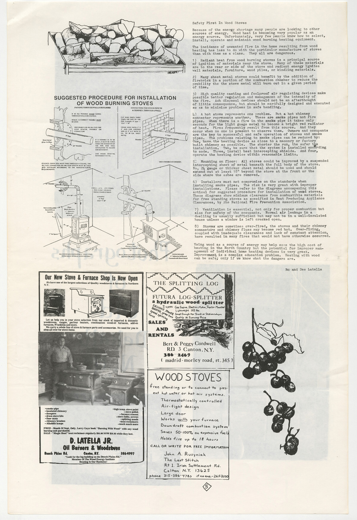 PDF:rootdrinker_v2_n7_1977-5.pdf(896.51 KB) Overview Issue:Rootdrinker: A Journal of the St. Lawrence Border Country; Volume 2, Number 7, Harvest 1977 Bibliographic Citation:Latella, Bo and Dee Latella. "Safety First in Wood Stoves." Rootdrinker 2.7 (1977): 5. Journal Title:Rootdrinker Creator: Latella, Bo, Latella, Dee Subject: Source:Original format: Published in Rootdrinker, volume 2, number 7, 1977. ODY Special Collections F127.S23 R66 Language:eng Start Page 5 Relation:Back to the Land Rights Rights Management:Original materials may be protected by the Copyright Law of the United States (more information). Resource Identifier:ODY Special Collections F127.S23 R66 Technical Digitization Specifications:Scanned at 600ppi on Epson 1000XL scanner as 48-bit RGB uncompressed TIFF images. Images resized to 1200 pixels wide, 150 dpi, and saved as JPEG (level 7) in Photoshop CS4 with Unsharp Mask of 60:1. Date Digital:January 14, 2010 - 20:00 Format:text/html Type:Text