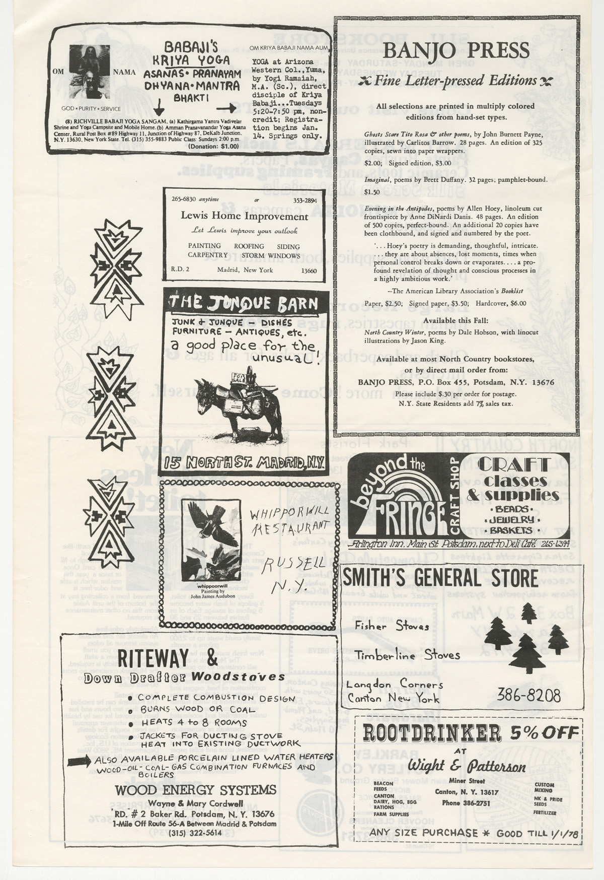 PDF:rootdrinker_v2_n7_1977-9.pdf(865.71 KB) Overview Issue:Rootdrinker: A Journal of the St. Lawrence Border Country; Volume 2, Number 7, Harvest 1977 Bibliographic Citation:Rootdrinker 2.7 (1977): 9. Journal Title:Rootdrinker Creator: Subject: Source:Original format: Published in Rootdrinker, volume 2, number 7, 1977. ODY Special Collections F127.S23 R66 Language:eng Start Page 9 Relation:Back to the Land Rights Rights Management:Original materials may be protected by the Copyright Law of the United States (more information). Resource Identifier:ODY Special Collections F127.S23 R66 Technical Digitization Specifications:Scanned at 600ppi on Epson 1000XL scanner as 48-bit RGB uncompressed TIFF images. Images resized to 1200 pixels wide, 150 dpi, and saved as JPEG (level 7) in Photoshop CS4 with Unsharp Mask of 60:1. Date Digital:January 14, 2010 - 20:00 Format:text/html Type:Text