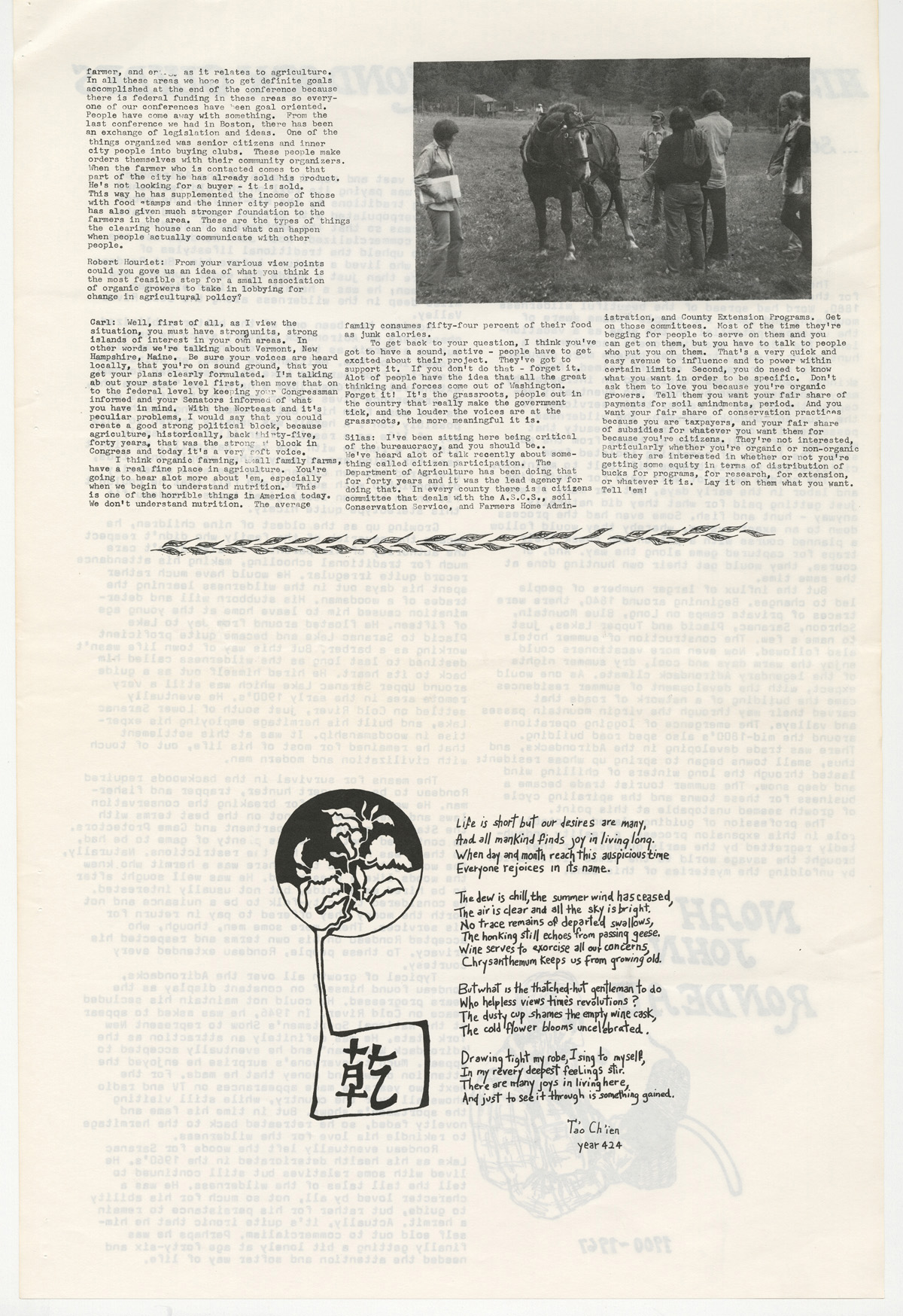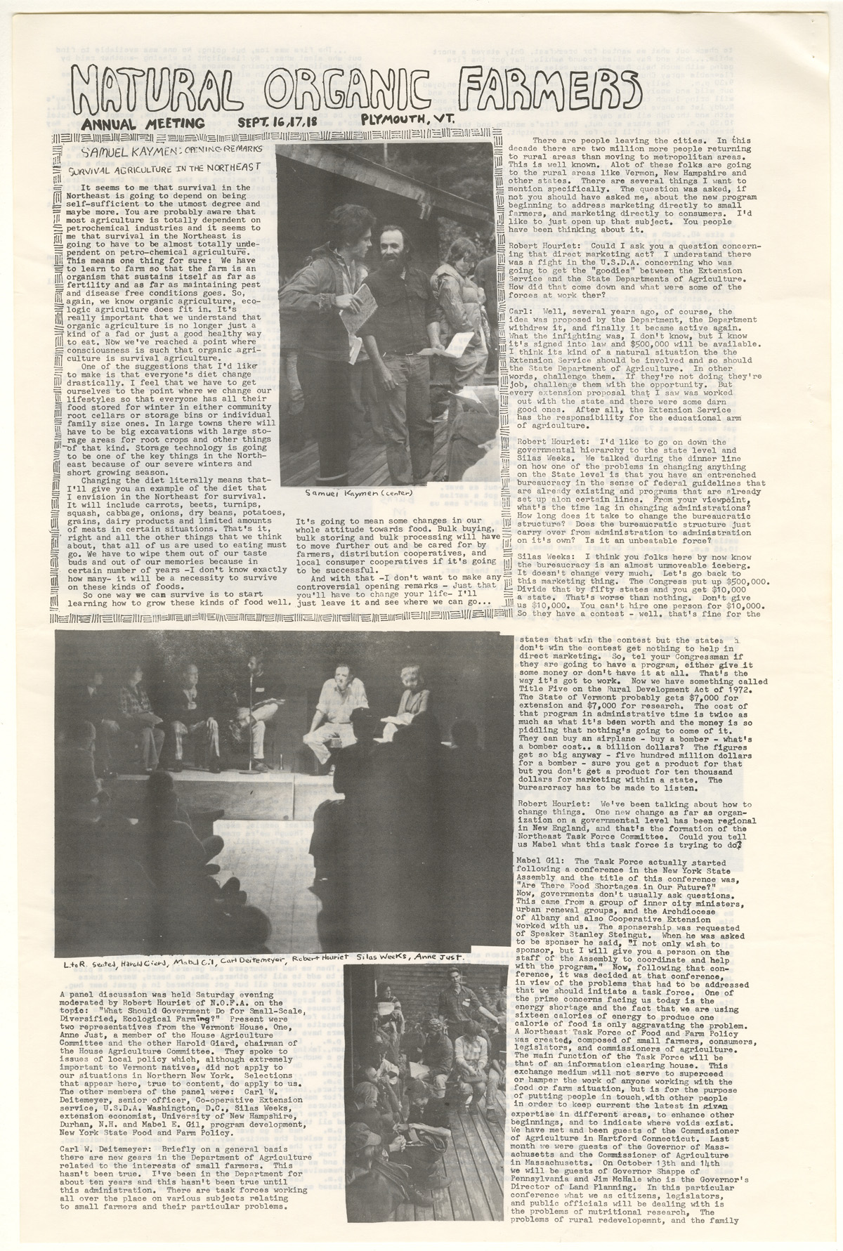 PDF:rootdrinker_v2_n7_1977-14-15.pdf(1.99 MB) Overview Issue:Rootdrinker: A Journal of the St. Lawrence Border Country; Volume 2, Number 7, Harvest 1977 Bibliographic Citation:"Natural Organic Farmers Annual Meeting." Rootdrinker 2.7 (1977): 14-15. Journal Title:Rootdrinker Creator: Subject: Source:Original format: Published in Rootdrinker, volume 2, number 7, 1977. ODY Special Collections F127.S23 R66 Language:eng Start Page 14 Relation:Back to the Land Rights Rights Management:Original materials may be protected by the Copyright Law of the United States (more information). Resource Identifier:ODY Special Collections F127.S23 R66 Technical Digitization Specifications:Scanned at 600ppi on Epson 1000XL scanner as 48-bit RGB uncompressed TIFF images. Images resized to 1200 pixels wide, 150 dpi, and saved as JPEG (level 7) in Photoshop CS4 with Unsharp Mask of 60:1. Date Digital:January 14, 2010 - 20:00 Format:text/html Type:Text