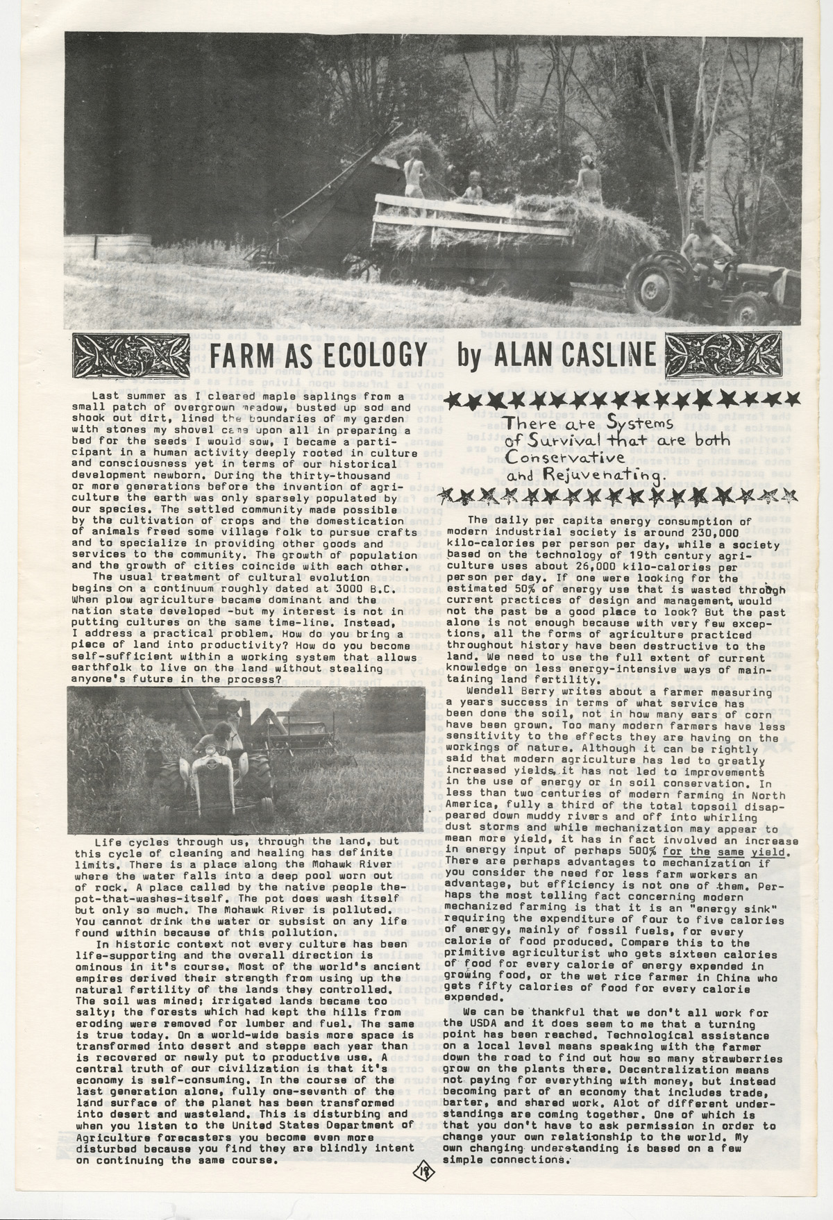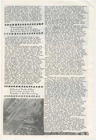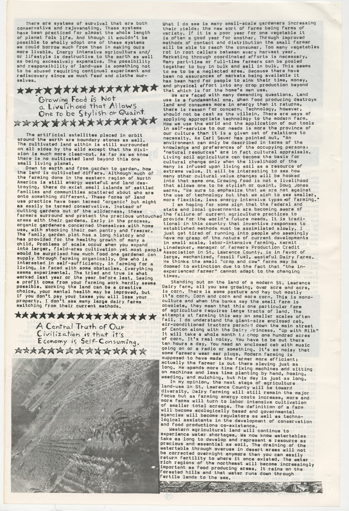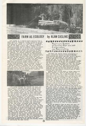 PDF:rootdrinker_v2_n7_1977-18-19.pdf(2.4 MB) Overview Issue:Rootdrinker: A Journal of the St. Lawrence Border Country; Volume 2, Number 7, Harvest 1977 Bibliographic Citation:Casline, Alan. "Farm as Ecology." Rootdrinker 2.7 (1977): 18-19. Journal Title:Rootdrinker Creator: Casline, Alan Subject: Source:Original format: Published in Rootdrinker, volume 2, number 7, 1977. ODY Special Collections F127.S23 R66 Language:eng Start Page 18 Relation:Back to the Land Rights Rights Management:Original materials may be protected by the Copyright Law of the United States (more information). Resource Identifier:ODY Special Collections F127.S23 R66 Technical Digitization Specifications:Scanned at 600ppi on Epson 1000XL scanner as 48-bit RGB uncompressed TIFF images. Images resized to 1200 pixels wide, 150 dpi, and saved as JPEG (level 7) in Photoshop CS4 with Unsharp Mask of 60:1. Date Digital:January 14, 2010 - 20:00 Format:text/html Type:Text