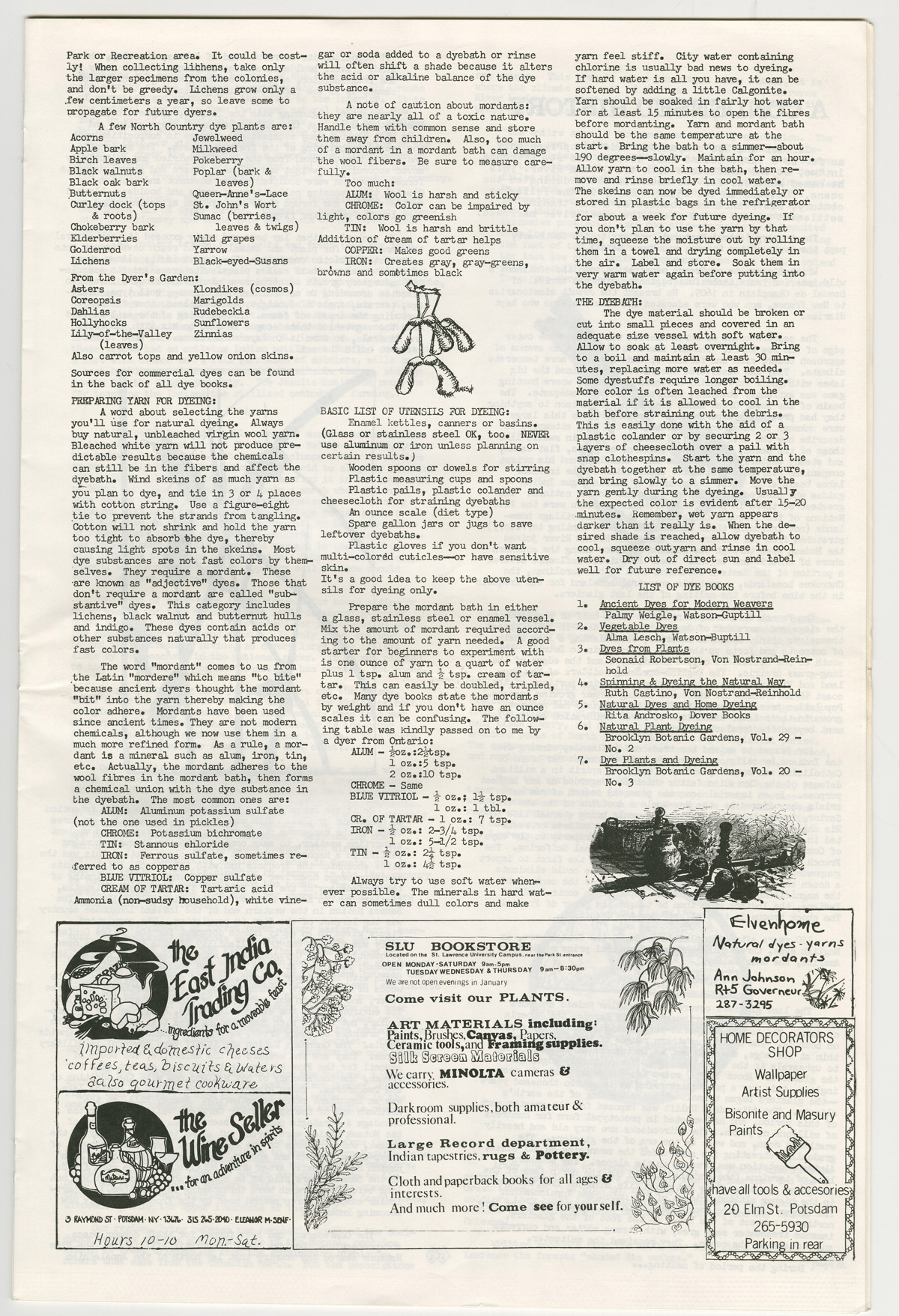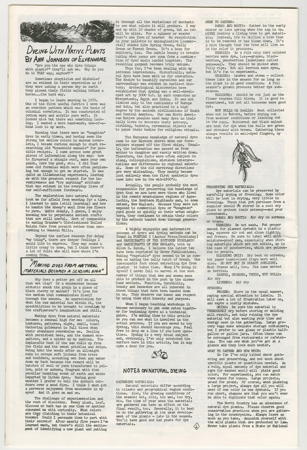 PDF:rootdrinker_v2_n8_1977-6-7.pdf(2.35 MB) Overview Issue:Rootdrinker: A Journal of the St. Lawrence Border Country; Volume 2, Number 8, Winter 1977 Bibliographic Citation:Johnson, Ann. "Dyeing With Native Plants." Rootdrinker 2.8 (1977): 6-7. Journal Title:Rootdrinker Creator: Johnson, Ann Subject: Source:Original format: Published in Rootdrinker, volume 2, number 8, 1977. ODY Special Collections F127.S23 R66 Language:eng Start Page 6 Relation:Back to the Land Rights Rights Management:Original materials may be protected by the Copyright Law of the United States (more information). Resource Identifier:ODY Special Collections F127.S23 R66 Technical Digitization Specifications:Scanned at 600ppi on Epson 1000XL scanner as 48-bit RGB uncompressed TIFF images. Images resized to 1200 pixels wide, 150 dpi, and saved as JPEG (level 7) in Photoshop CS4 with Unsharp Mask of 60:1. Date Digital:January 17, 2010 - 20:00 Format:text/html Type:Text