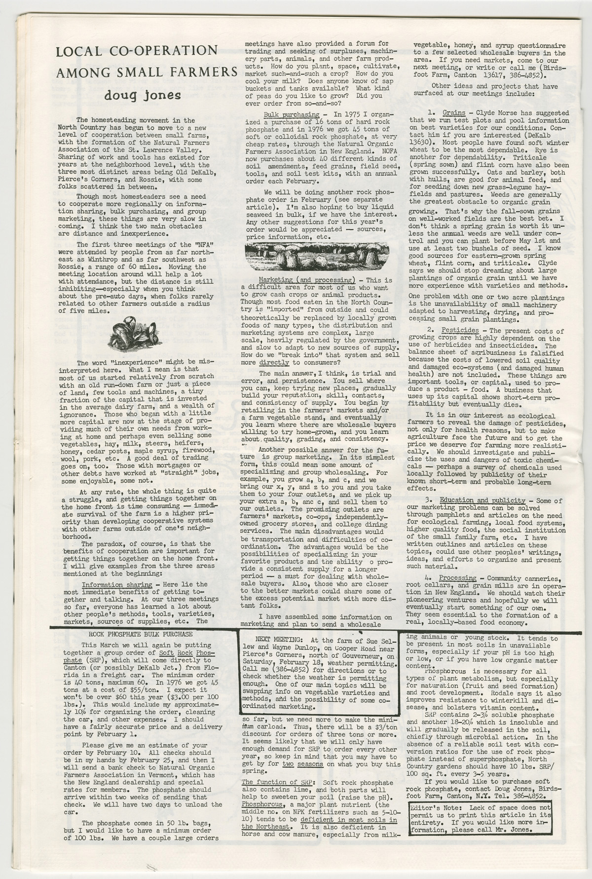 Jones, Doug. "Local Co-operation Among Small Farmers." Rootdrinker 2.8 (1977): 14.
