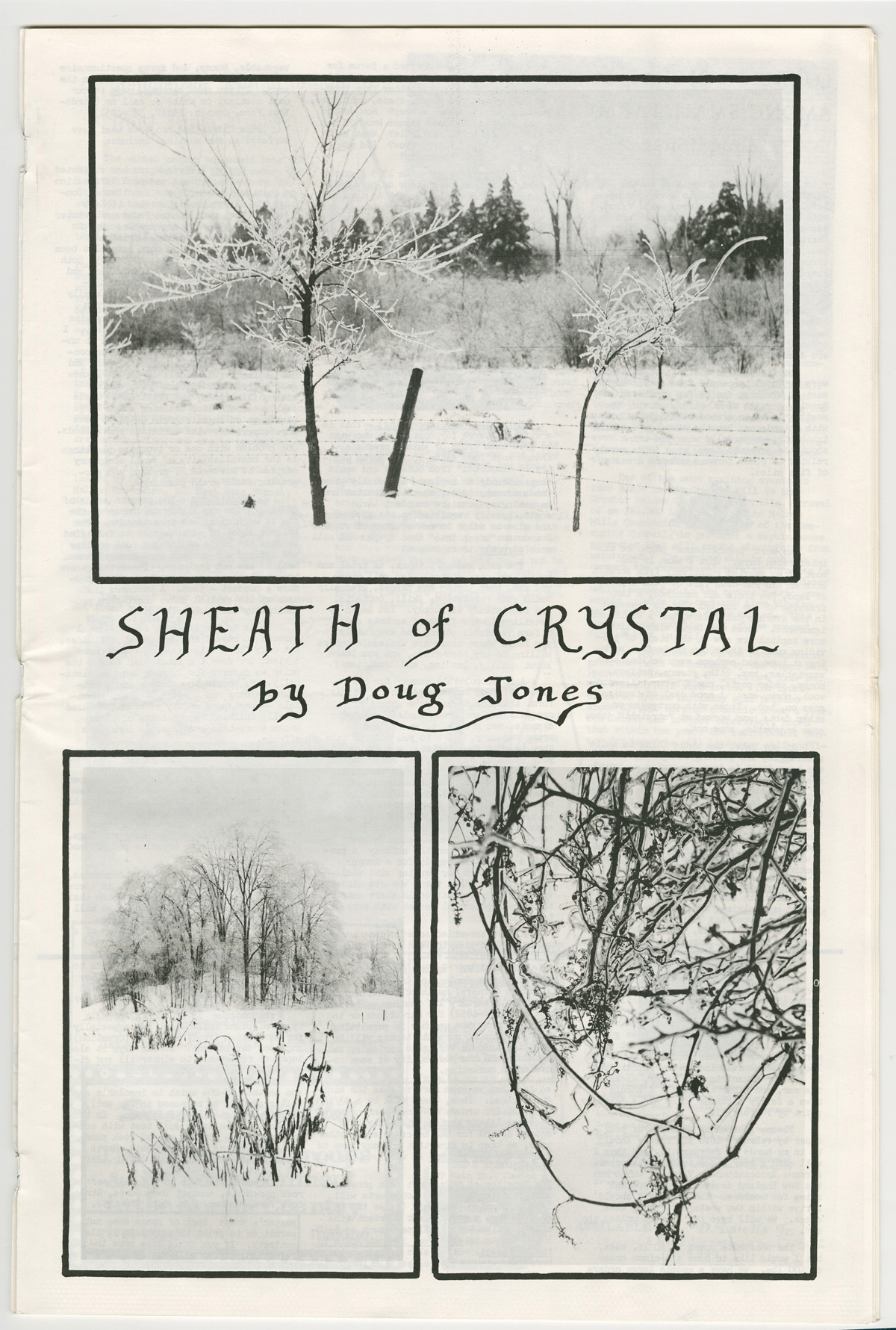 PDF:rootdrinker_v2_n8_1977-13.pdf(1.09 MB) Overview Issue:Rootdrinker: A Journal of the St. Lawrence Border Country; Volume 2, Number 8, Winter 1977 Bibliographic Citation:Jones, Doug. "Sheath of Crystal." Rootdrinker 2.8 (1977): 13. Journal Title:Rootdrinker Creator: Jones, Doug Subject: Source:Original format: Published in Rootdrinker, volume 2, number 8, 1977. ODY Special Collections F127.S23 R66 Language:eng Start Page 13 Relation:Back to the Land Rights Rights Management:Original materials may be protected by the Copyright Law of the United States (more information). Resource Identifier:ODY Special Collections F127.S23 R66 Technical Digitization Specifications:Scanned at 600ppi on Epson 1000XL scanner as 48-bit RGB uncompressed TIFF images. Images resized to 1200 pixels wide, 150 dpi, and saved as JPEG (level 7) in Photoshop CS4 with Unsharp Mask of 60:1. Date Digital:January 17, 2010 - 20:00 Format:text/html Type:Text