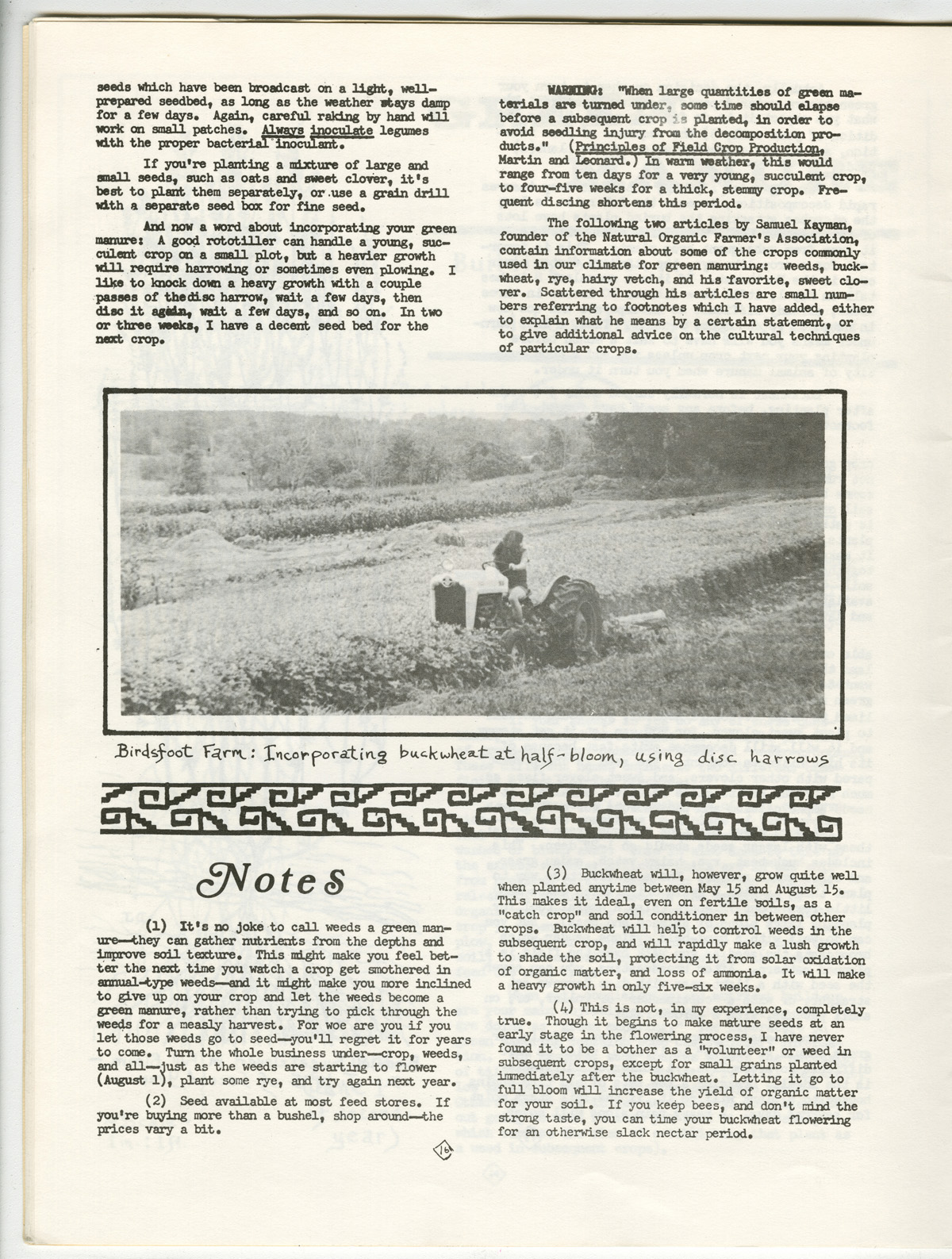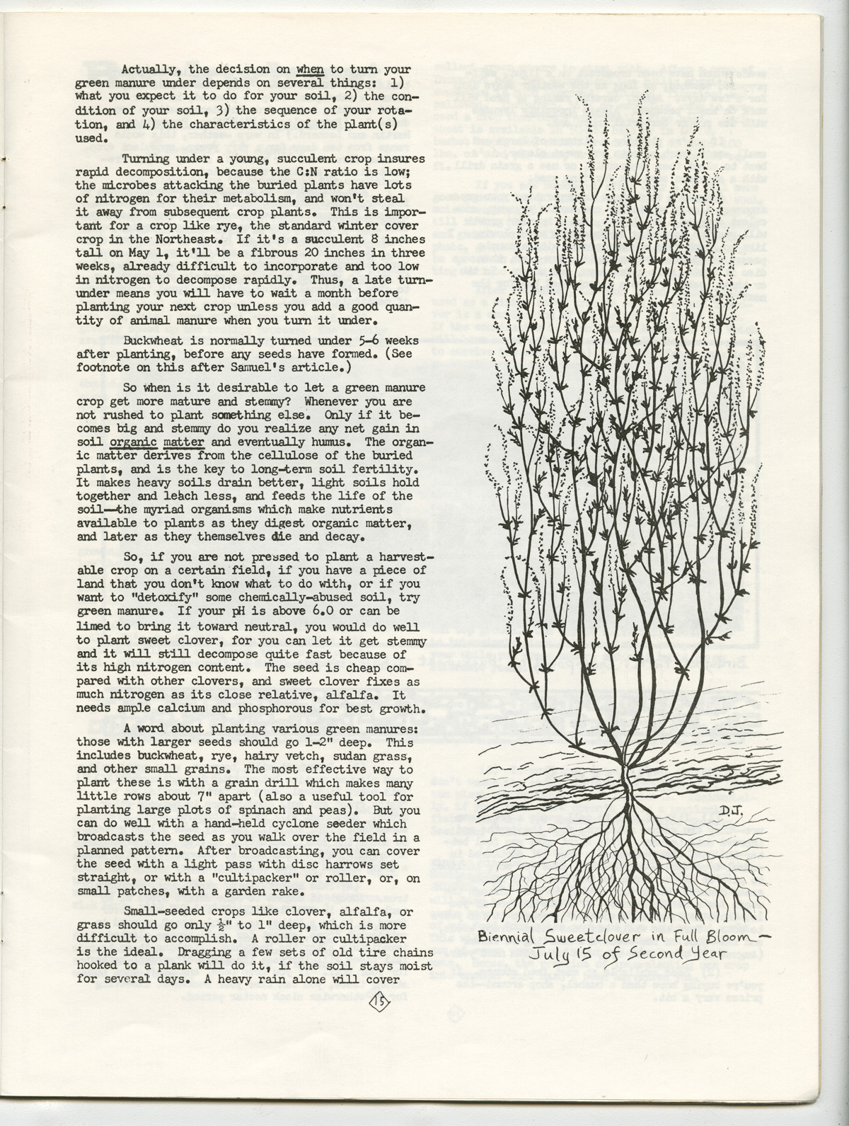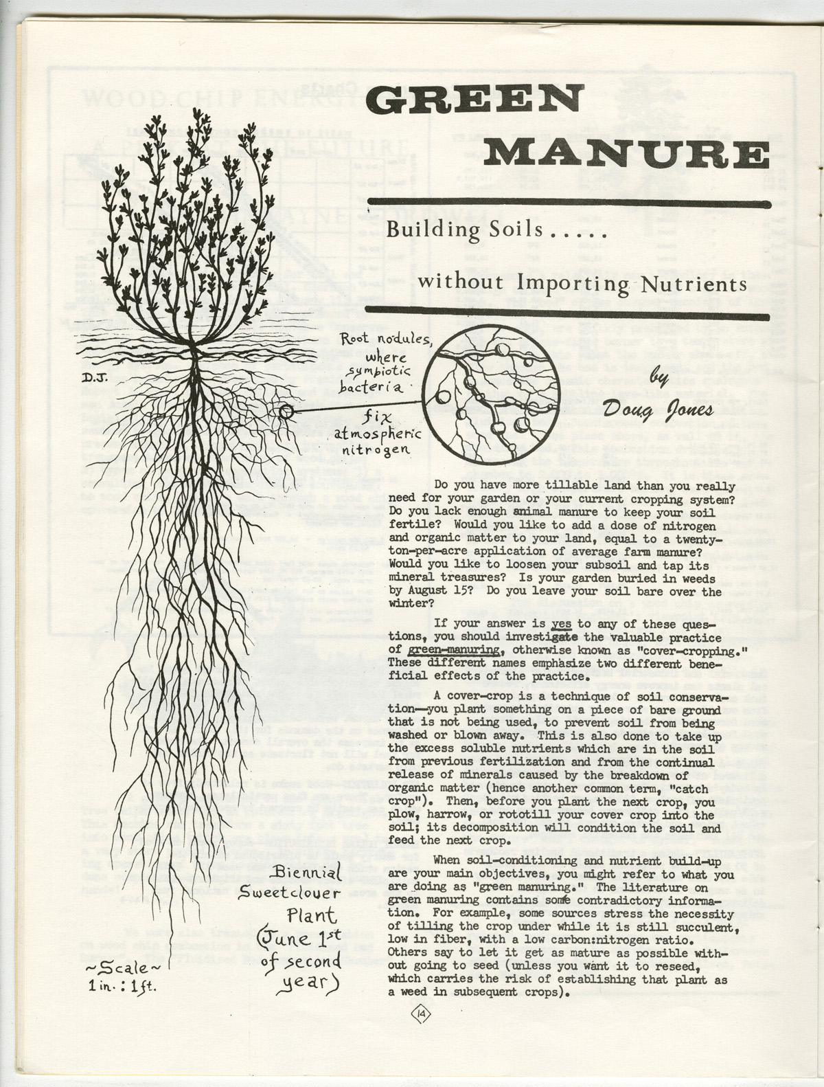 PDF:rootdrinker_v3_n9_1978-14-18.pdf(4.36 MB) Overview Issue:Rootdrinker: A Journal of the St. Lawrence Border Country; Volume 3, Number 9, Spring 1978 Bibliographic Citation:Jones, Doug. "Green Manure: Building Soils with Importing Nutrients." Rootdrinker 3.9 (1978): 14-18. Journal Title:Rootdrinker Creator: Jones, Doug Subject: Source:Original format: Published in Rootdrinker, volume 3, number 9, 1978. ODY Special Collections F127.S23 R66 Language:eng Start Page 14 Relation:Back to the Land Rights Rights Management:Original materials may be protected by the Copyright Law of the United States (more information). Resource Identifier:ODY Special Collections F127.S23 R66 Technical Digitization Specifications:Scanned at 600ppi on Epson 1000XL scanner as 48-bit RGB uncompressed TIFF images. Images resized to 1200 pixels wide, 150 dpi, and saved as JPEG (level 7) in Photoshop CS4 with Unsharp Mask of 60:1. Date Digital:January 17, 2010 - 20:00 Format:text/html Type:Text