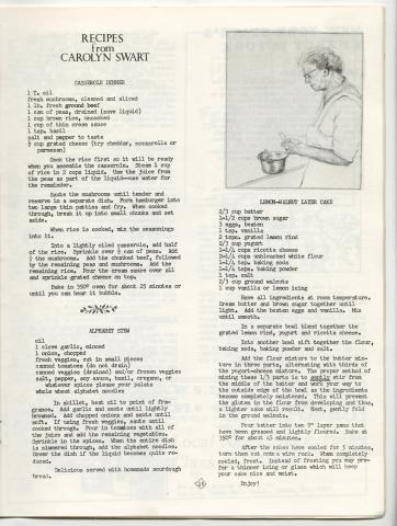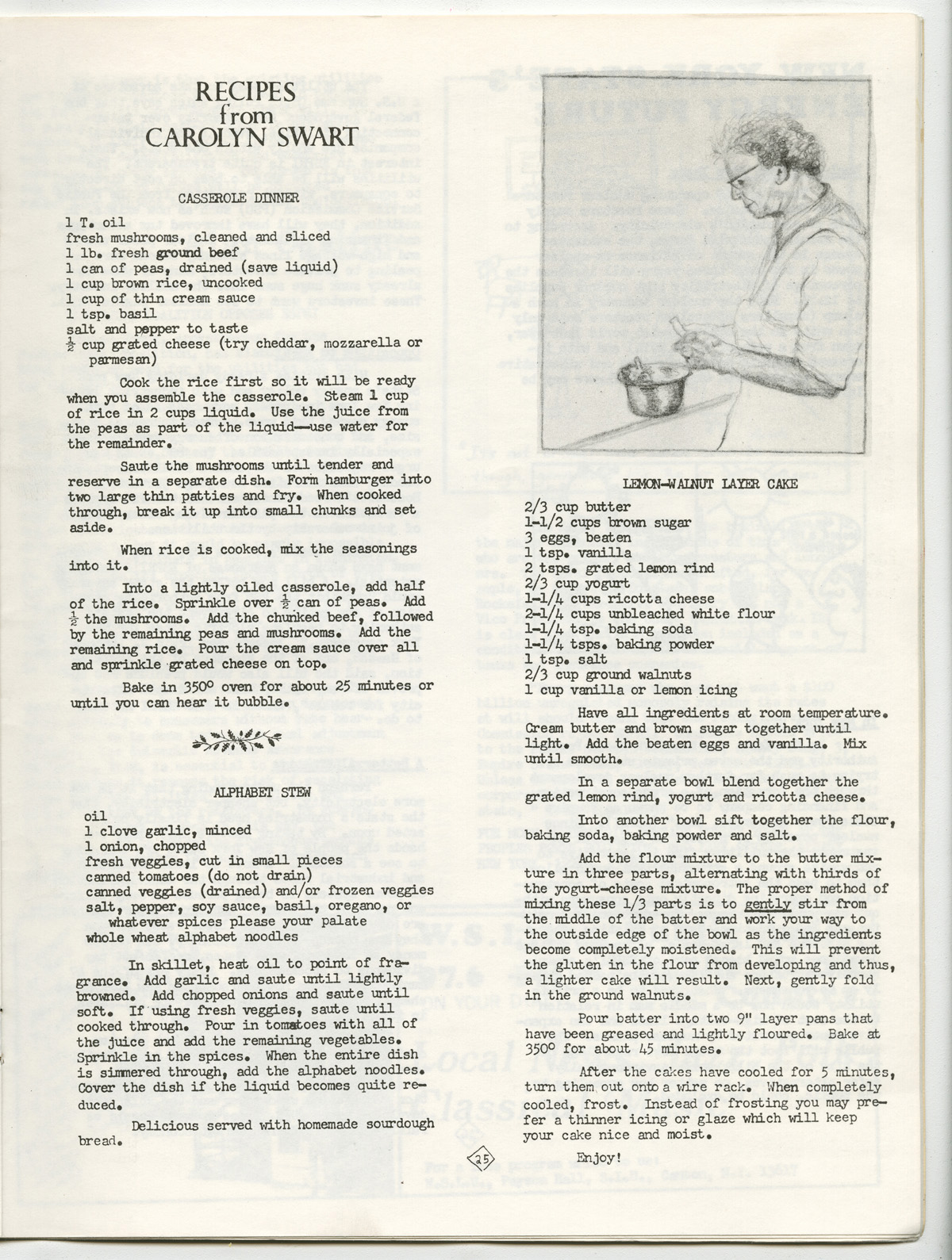 PDF:rootdrinker_v3_n9_1978-25.pdf(816.17 KB) Overview Issue:Rootdrinker: A Journal of the St. Lawrence Border Country; Volume 3, Number 9, Spring 1978 Bibliographic Citation:Swart, Carolyn. "Recipes." Rootdrinker 3.9 (1978): 25. Journal Title:Rootdrinker Creator: Swart, Carolyn Subject: Source:Original format: Published in Rootdrinker, volume 3, number 9, 1978. ODY Special Collections F127.S23 R66 Language:eng Start Page 25 Relation:Back to the Land Rights Rights Management:Original materials may be protected by the Copyright Law of the United States (more information). Resource Identifier:ODY Special Collections F127.S23 R66 Technical Digitization Specifications:Scanned at 600ppi on Epson 1000XL scanner as 48-bit RGB uncompressed TIFF images. Images resized to 1200 pixels wide, 150 dpi, and saved as JPEG (level 7) in Photoshop CS4 with Unsharp Mask of 60:1. Date Digital:January 17, 2010 - 20:00 Format:text/html Type:Text