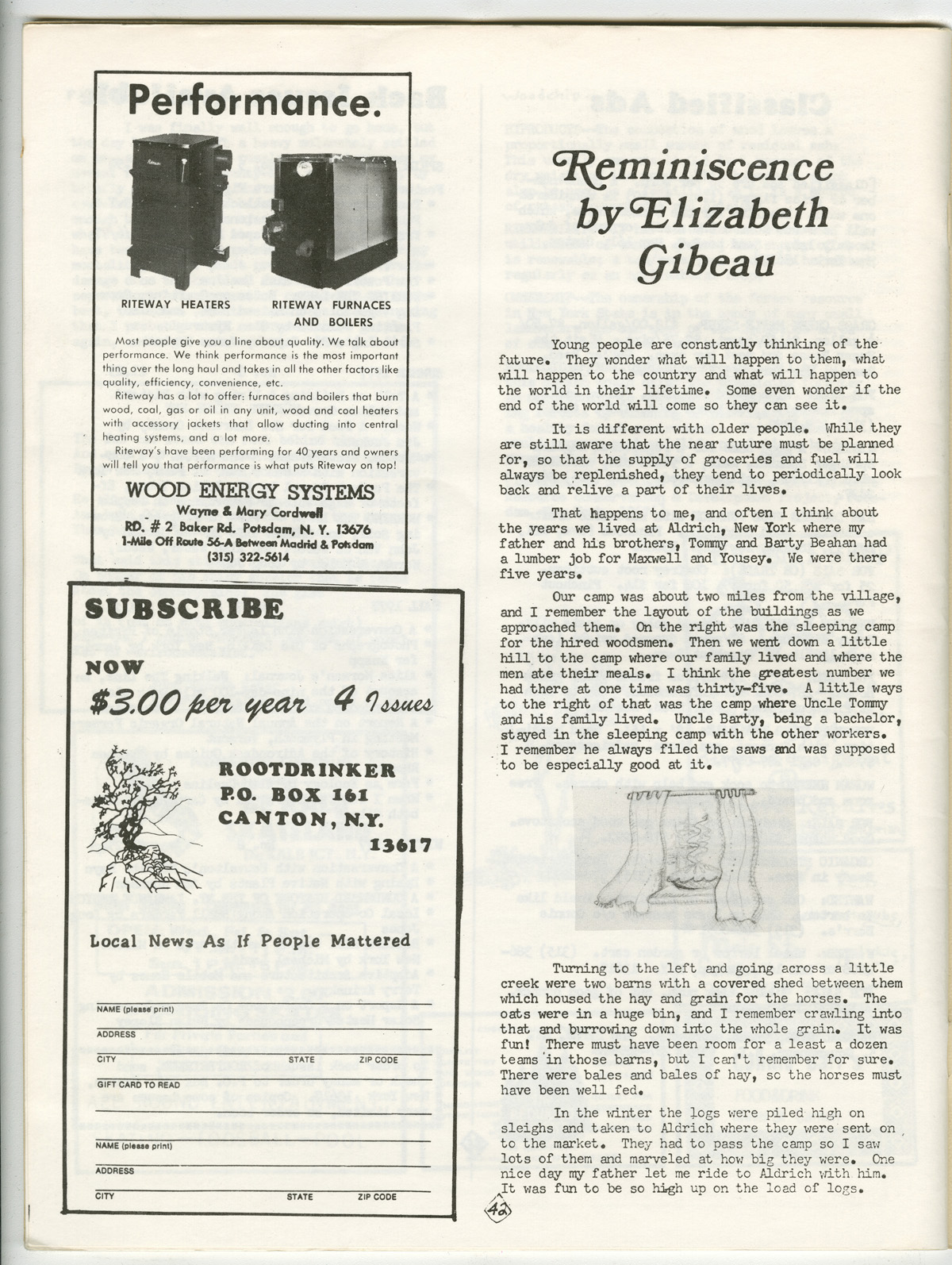 PDF:rootdrinker_v3_n9_1978-42-43.pdf(1.79 MB) Overview Issue:Rootdrinker: A Journal of the St. Lawrence Border Country; Volume 3, Number 9, Spring 1978 Bibliographic Citation:Gibeau, Elizabeth. "Reminiscence." Rootdrinker 3.9 (1978): 42-43. Journal Title:Rootdrinker Creator: Gibeau, Elizabeth Subject: Source:Original format: Published in Rootdrinker, volume 3, number 9, 1978. ODY Special Collections F127.S23 R66 Language:eng Start Page 42 Relation:Back to the Land Rights Rights Management:Original materials may be protected by the Copyright Law of the United States (more information). Resource Identifier:ODY Special Collections F127.S23 R66 Technical Digitization Specifications:Scanned at 600ppi on Epson 1000XL scanner as 48-bit RGB uncompressed TIFF images. Images resized to 1200 pixels wide, 150 dpi, and saved as JPEG (level 7) in Photoshop CS4 with Unsharp Mask of 60:1. Date Digital:January 17, 2010 - 20:00 Format:text/html Type:Text