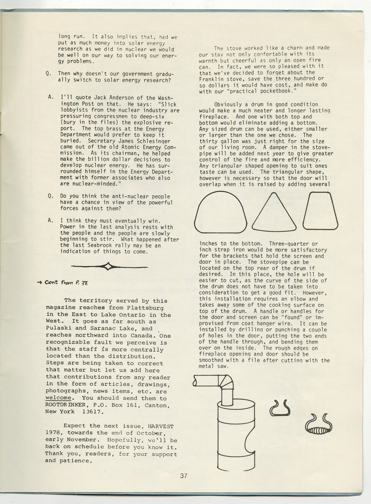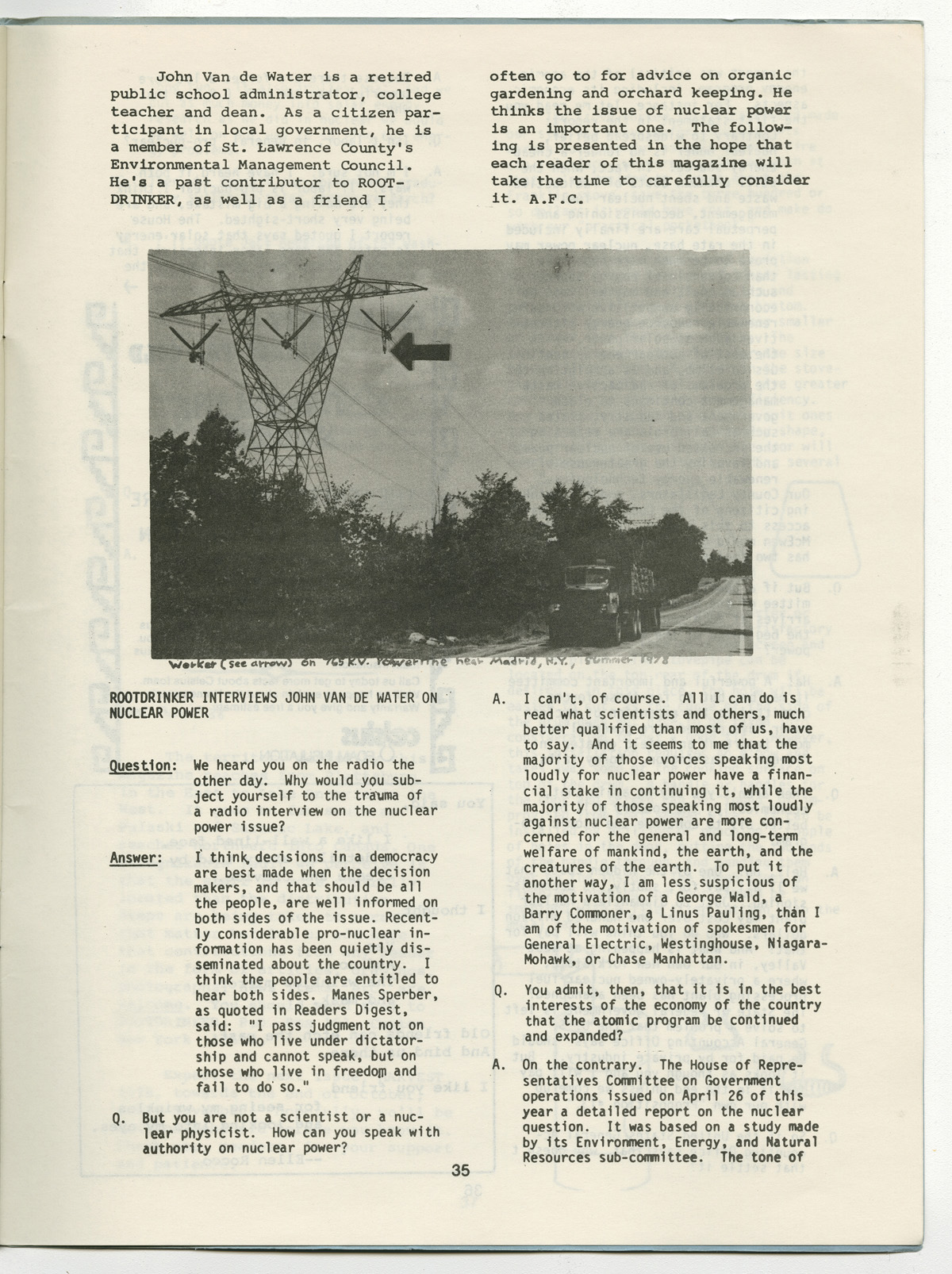 PDF:rootdrinker_v3_n10_1978-35-37.pdf(2.24 MB) Overview Issue:Rootdrinker: A Journal of the St. Lawrence Border Country; Volume 3, Number 10, Late Summer 1978 Bibliographic Citation:Casline, Alan. "Rootdrinker Interviews John Van de Water on Nuclear Power." Rootdrinker 3.10 (1978): 35-37. Journal Title:Rootdrinker Creator: Casline, Alan Subject: Source:Original format: Published in Rootdrinker, volume 3, number 10, 1978. ODY Special Collections F127.S23 R66 Language:eng Start Page 35 Relation:Back to the Land Rights Rights Management:Original materials may be protected by the Copyright Law of the United States (more information). Resource Identifier:ODY Special Collections F127.S23 R66 Technical Digitization Specifications:Scanned at 600ppi on Epson 1000XL scanner as 48-bit RGB uncompressed TIFF images. Images resized to 1200 pixels wide, 150 dpi, and saved as JPEG (level 7) in Photoshop CS4 with Unsharp Mask of 60:1. Date Digital:January 19, 2010 - 20:00 Format:text/html Type:Text