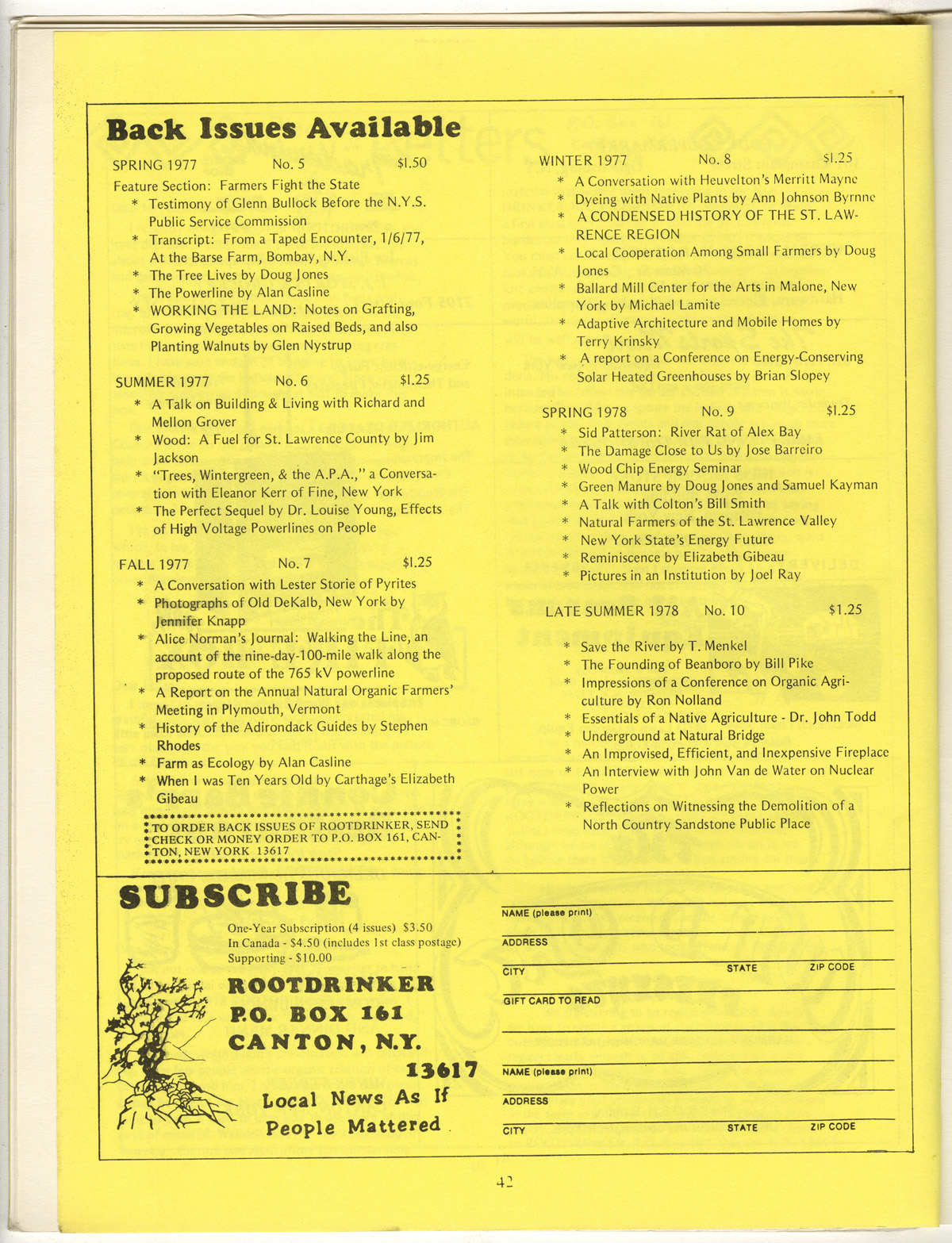 PDF:rootdrinker_v3_n11_1978_42.pdf(794.28 KB) Overview Issue:Rootdrinker; Volume 3, Number 11, Winter 1978-79 Bibliographic Citation:Rootdrinker 3.11 (1978): 42. Journal Title:Rootdrinker Creator: Subject: Source:Original format: Published in Rootdrinker, volume 3, number 11, 1978-79. ODY Special Collections F127.S23 R66 Language:eng Start Page 42 Relation:Back to the Land Rights Rights Management:Original materials may be protected by the Copyright Law of the United States (more information). Resource Identifier:ODY Special Collections F127.S23 R66 Technical Digitization Specifications:Scanned at 600ppi on Epson 1000XL scanner as 48-bit RGB uncompressed TIFF images. Images resized to 1200 pixels wide, 150 dpi, and saved as JPEG (level 7) in Photoshop CS4 with Unsharp Mask of 60:1. Date Digital:January 24, 2010 - 20:00 Format:text/html Type:Text