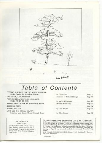PDF:rootdrinker_v3_n12_1979_3.pdf(559.54 KB) Overview Issue:Rootdrinker; Volume 3, Number 12, Spring 1979 Bibliographic Citation:Rootdrinker 3.12 (1979): 3. Journal Title:Rootdrinker Creator: Subject: Source:Original format: Published in Rootdrinker, volume 3, number 12, 1979. ODY Special Collections F127.S23 R66 Language:eng Start Page 3 Relation:Back to the Land Rights Rights Management:Original materials may be protected by the Copyright Law of the United States (more information). Resource Identifier:ODY Special Collections F127.S23 R66 Technical Digitization Specifications:Scanned at 600ppi on Epson 1000XL scanner as 48-bit RGB uncompressed TIFF images. Images resized to 1200 pixels wide, 150 dpi, and saved as JPEG (level 7) in Photoshop CS4 with Unsharp Mask of 60:1. Date Digital:January 26, 2010 - 20:00 Format:text/html Type:Text