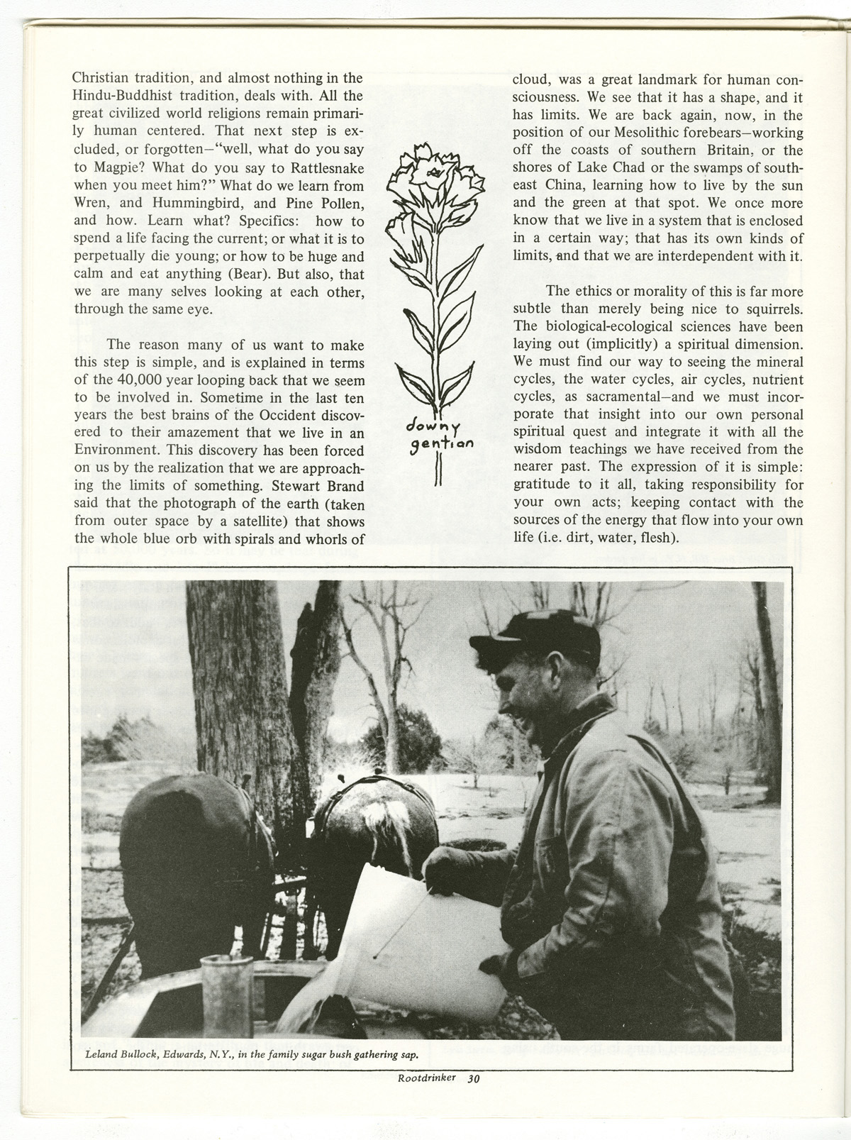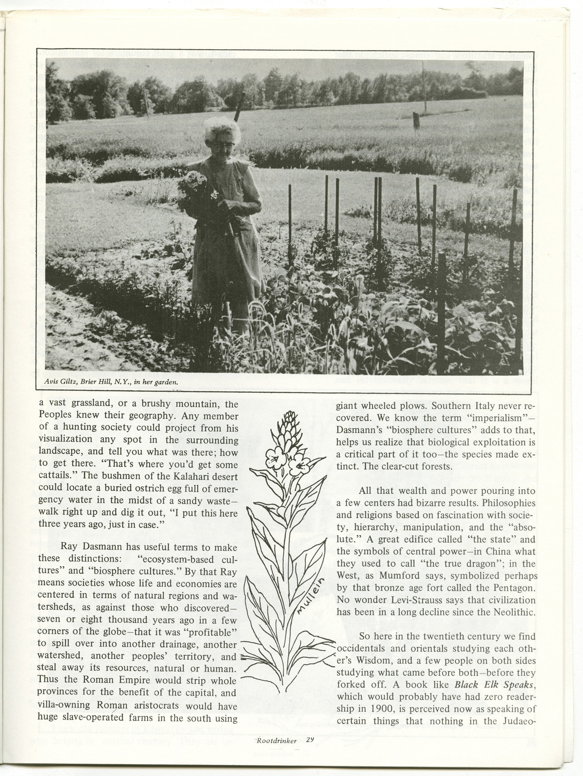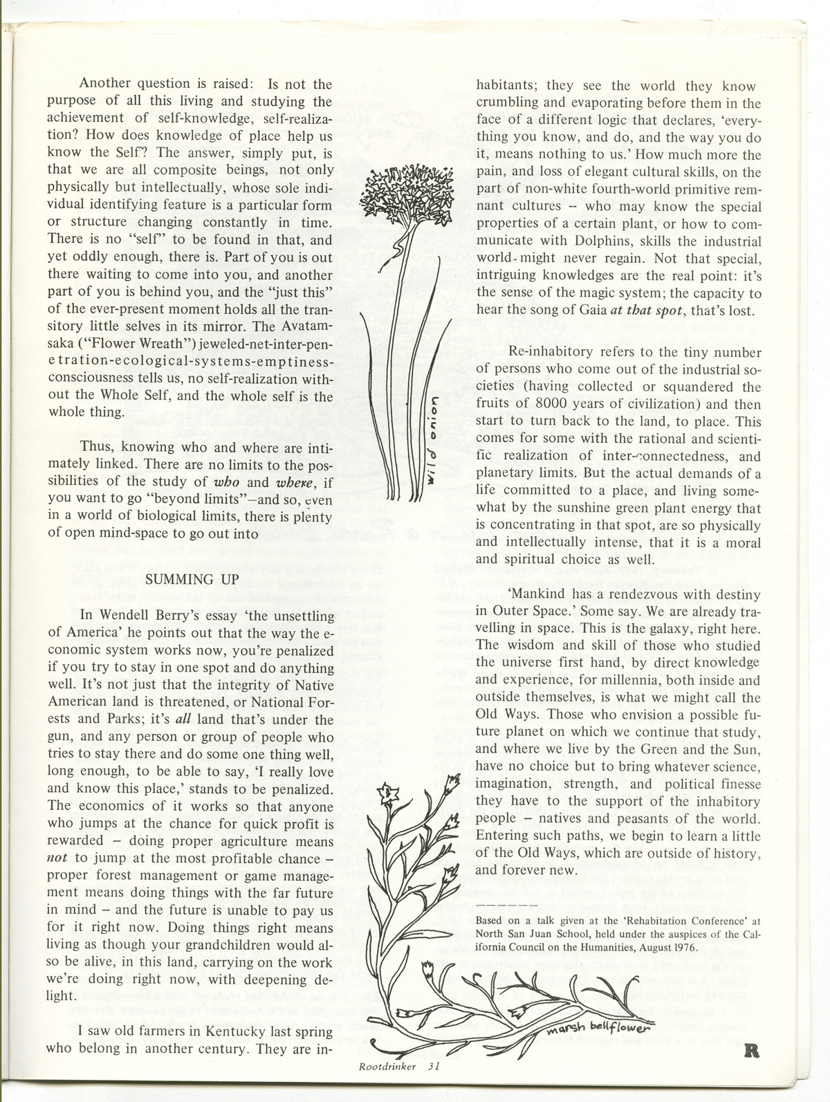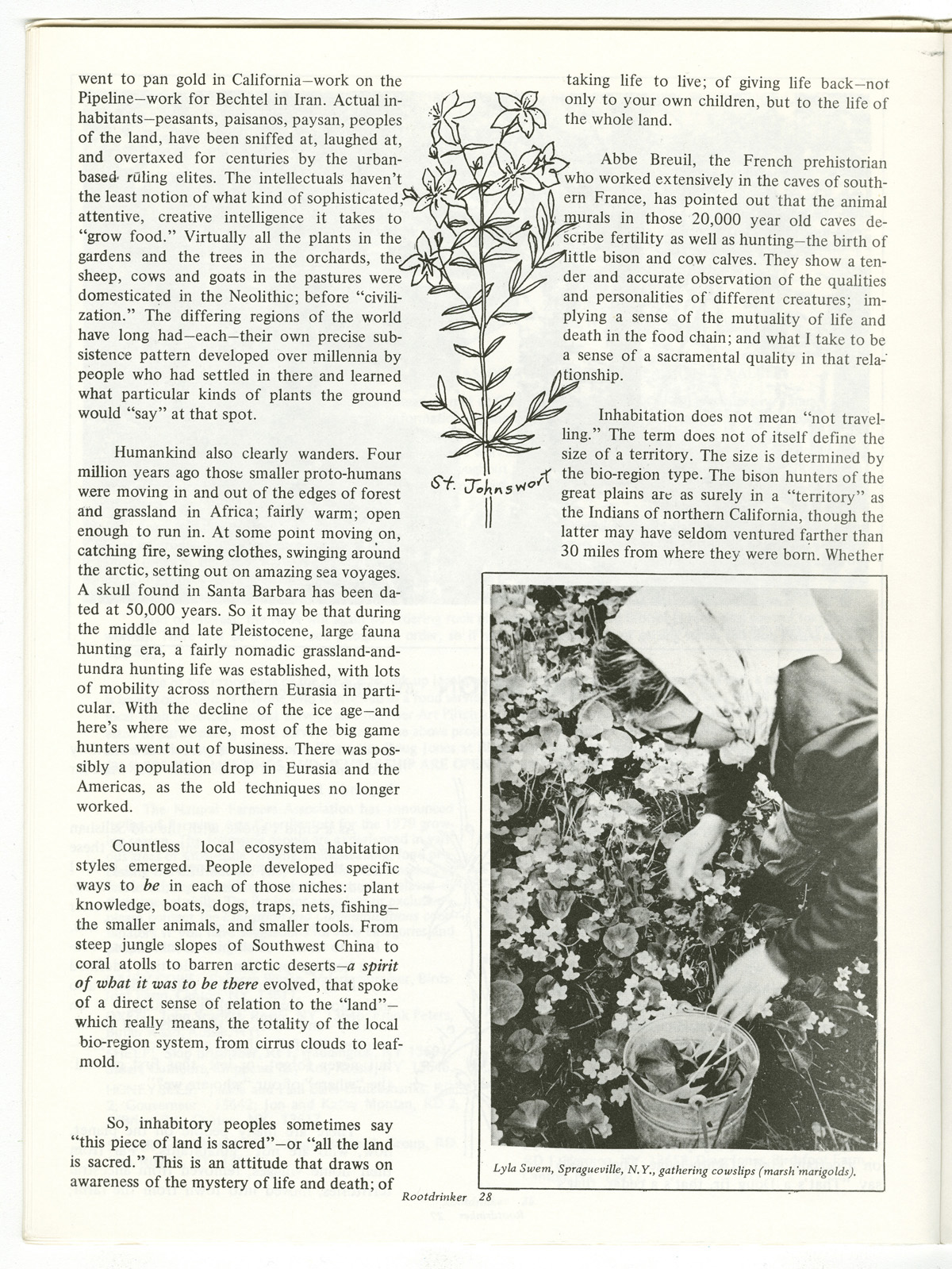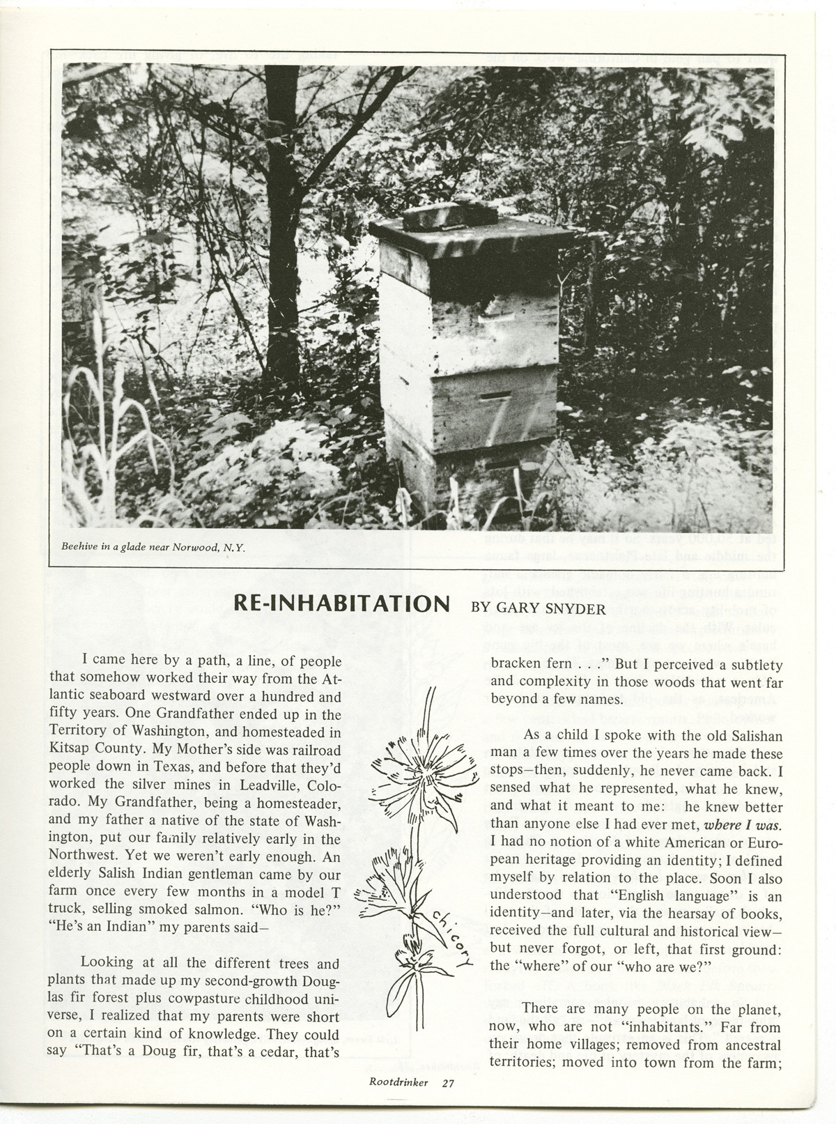 PDF:rootdrinker_v3_n12_1979_27-31.pdf(4.66 MB) Overview Issue:Rootdrinker; Volume 3, Number 12, Spring 1979 Bibliographic Citation:Snyder, Gary. "Re-Inhabitation." Rootdrinker 3.12 (1979): 27-31. Journal Title:Rootdrinker Creator: Snyder, Gary Subject: Source:Original format: Published in Rootdrinker, volume 3, number 12, 1979. ODY Special Collections F127.S23 R66 Language:eng Start Page 27 Relation:Back to the Land Rights Rights Management:Original materials may be protected by the Copyright Law of the United States (more information). Resource Identifier:ODY Special Collections F127.S23 R66 Technical Digitization Specifications:Scanned at 600ppi on Epson 1000XL scanner as 48-bit RGB uncompressed TIFF images. Images resized to 1200 pixels wide, 150 dpi, and saved as JPEG (level 7) in Photoshop CS4 with Unsharp Mask of 60:1. Date Digital:January 26, 2010 - 20:00 Format:text/html Type:Text