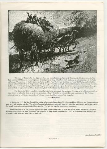 PDF:rootdrinker_v3_n13_1979_5.pdf(1.06 MB) Overview Issue:Rootdrinker; Volume 3, Number 13, Autumn 1979 Bibliographic Citation:Casline, Alan. Publisher's Remarks. Rootdrinker 3.13 (1979): 5. Journal Title:Rootdrinker Creator: Subject: Source:Original format: Published in Rootdrinker, volume 3, number 13, 1979. ODY Special Collections F127.S23 R66 Language:eng Start Page 5 Relation:Back to the Land Rights Rights Management:Original materials may be protected by the Copyright Law of the United States (more information). Resource Identifier:ODY Special Collections F127.S23 R66 Technical Digitization Specifications:Scanned at 600ppi on Epson 1000XL scanner as 48-bit RGB uncompressed TIFF images. Images resized to 1200 pixels wide, 150 dpi, and saved as JPEG (level 7) in Photoshop CS4 with Unsharp Mask of 60:1. Date Digital:January 27, 2010 - 20:00 Format:text/html Type:Text
