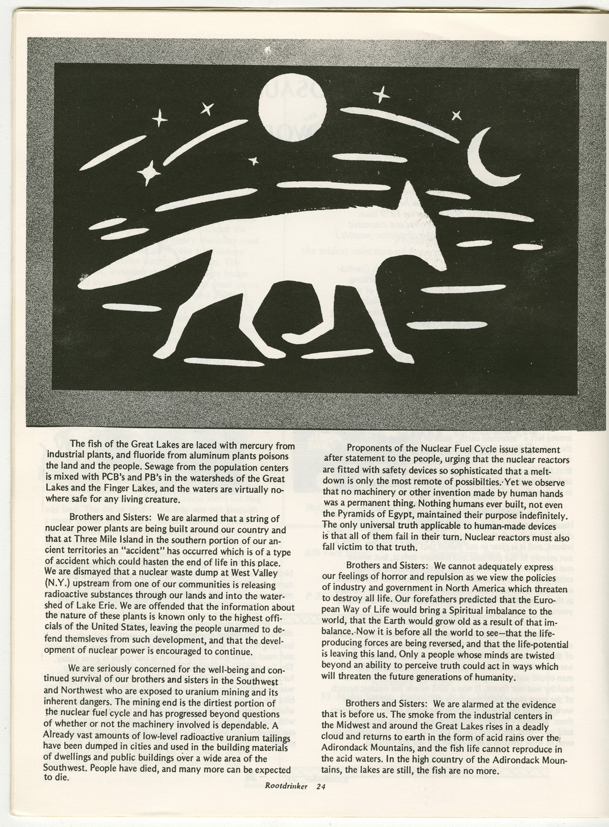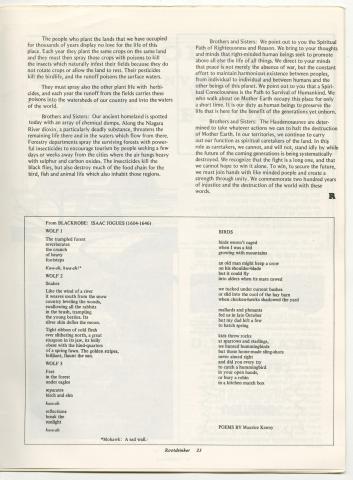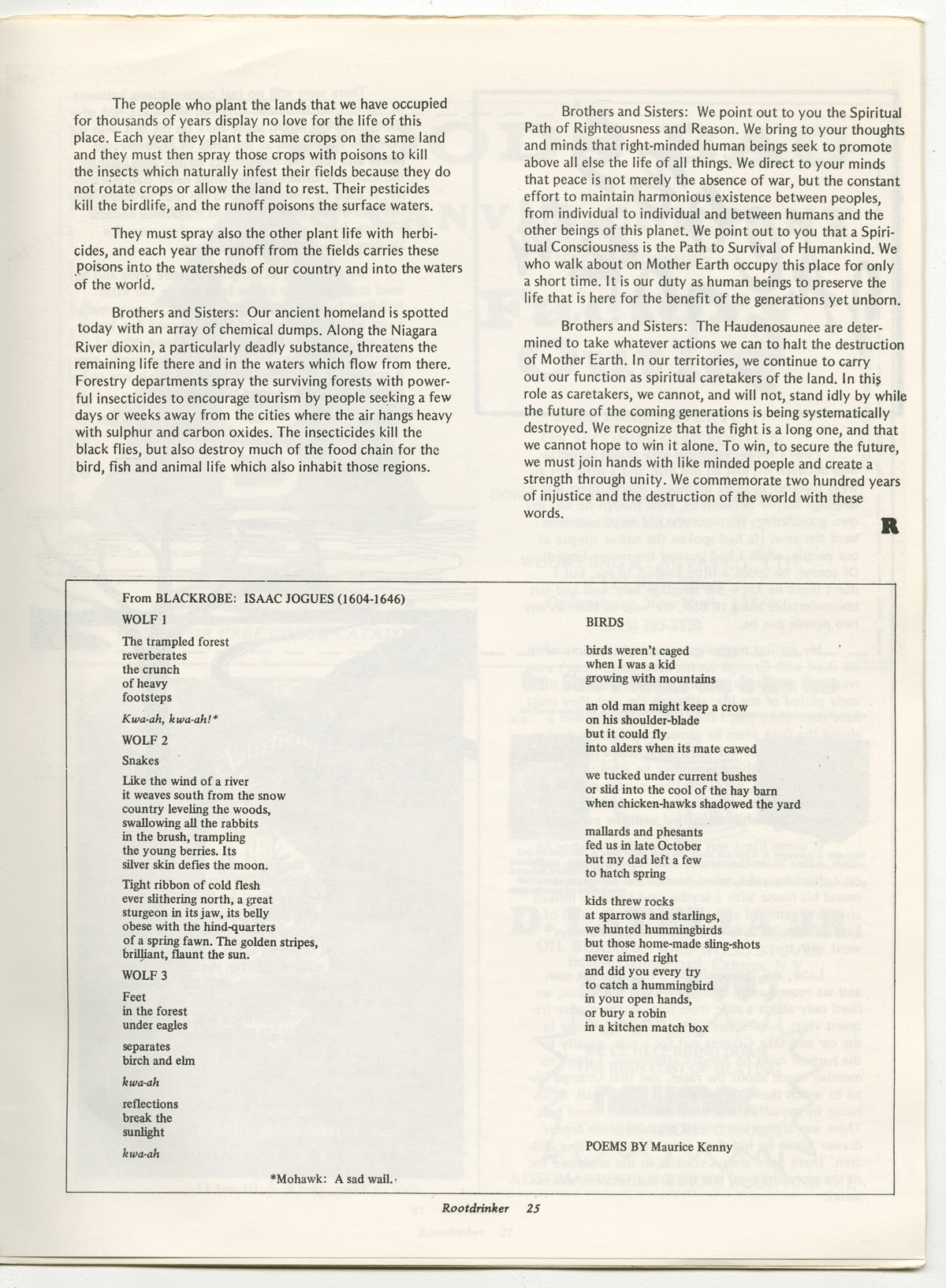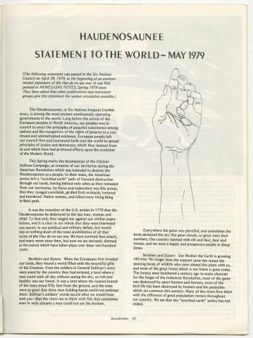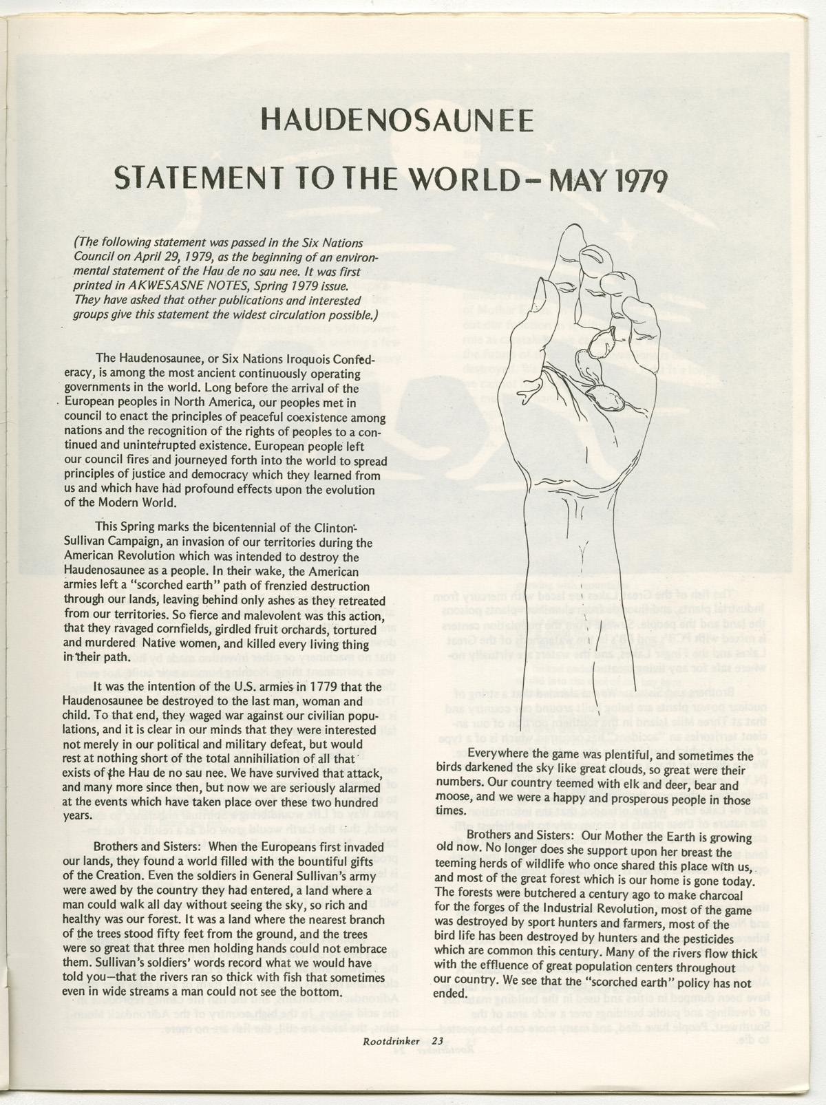 PDF:rootdrinker_v3_n13_1979_23-25.pdf(2.32 MB) Overview Issue:Rootdrinker; Volume 3, Number 13, Autumn 1979 Bibliographic Citation:"Haudenosaunee Statement to the World: May 1979." Rootdrinker 3.13 (1979): 23-15. Journal Title:Rootdrinker Creator: Subject: Source:Original format: Published in Rootdrinker, volume 3, number 13, 1979. ODY Special Collections F127.S23 R66 Language:eng Start Page 23 Relation:Back to the Land Rights Rights Management:Original materials may be protected by the Copyright Law of the United States (more information). Resource Identifier:ODY Special Collections F127.S23 R66 Technical Digitization Specifications:Scanned at 600ppi on Epson 1000XL scanner as 48-bit RGB uncompressed TIFF images. Images resized to 1200 pixels wide, 150 dpi, and saved as JPEG (level 7) in Photoshop CS4 with Unsharp Mask of 60:1. Date Digital:January 27, 2010 - 20:00 Format:text/html Type:Text