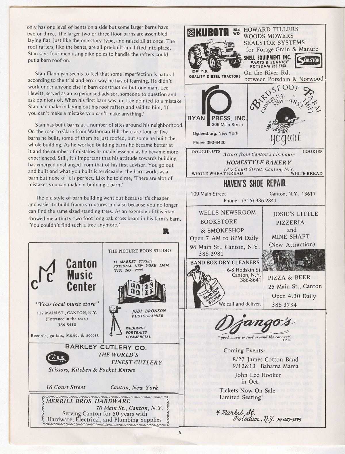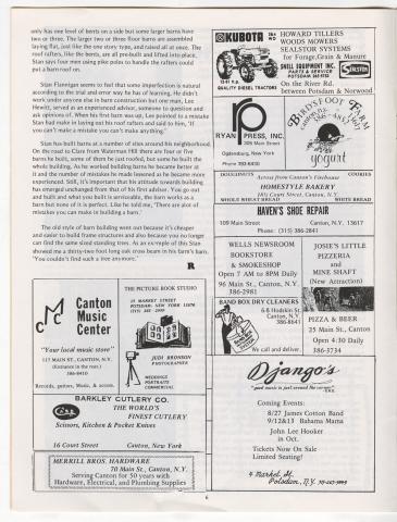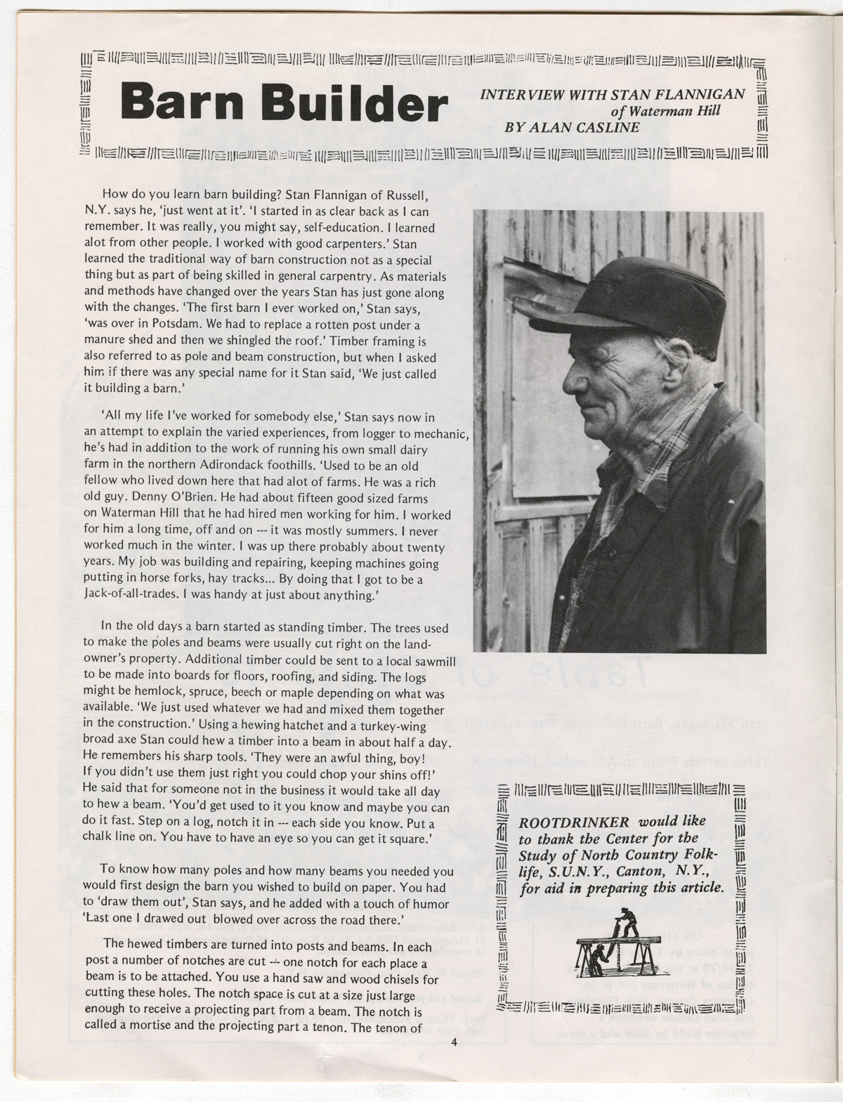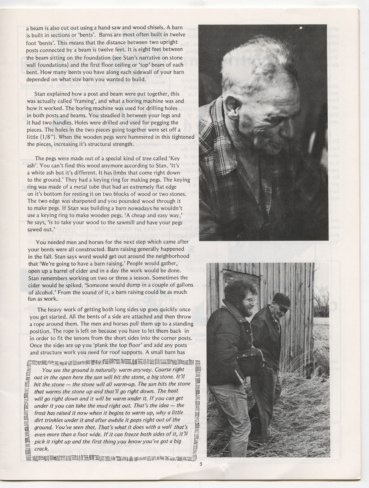 PDF:rootdrinker_n14_1980-4-6.pdf(923.59 KB) Overview Issue:Rootdrinker: Volume 3, Number 14, September 1980 Bibliographic Citation:Casline, Alan. "Barn Builder: Interview with Stan Flannigan of Waterman Hill. "Rootdrinker 3.14 (1980): 4-6. Journal Title:Rootdrinker Creator: Casline, Alan Subject: Source:Original format: Published in Rootdrinker, volume 3, number 14, 1980. ODY Special Collections F127.S23 R66 Language:eng Start Page 4 Relation:Back to the Land Rights Rights Management:Original materials may be protected by the Copyright Law of the United States (more information). Resource Identifier:ODY Special Collections F127.S23 R66 Technical Digitization Specifications:Scanned at 600ppi on Epson 1000XL scanner as 48-bit RGB uncompressed TIFF images. Images resized to 960 pixels wide, 150 dpi, and saved as JPEG (level 7) in Photoshop CS4 with Unsharp Mask of 60:1. Date Digital:November 19, 2009 - 20:00 Format:text/html Type:Text