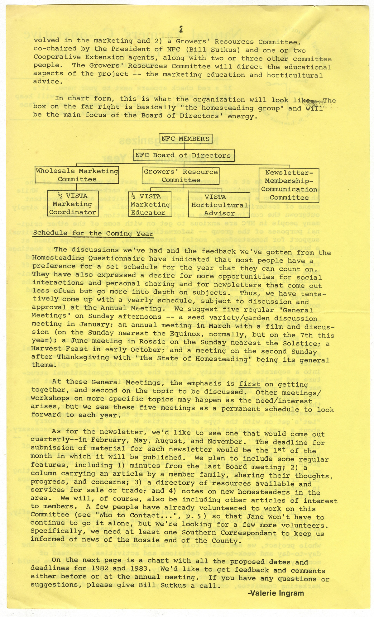 Ingram, Valerie. "Schedule for the Coming Year." Newsletter of the Natural Farmers' Co-operative of the St. Lawrence Valley, Inc. (Winter 1982): 2.