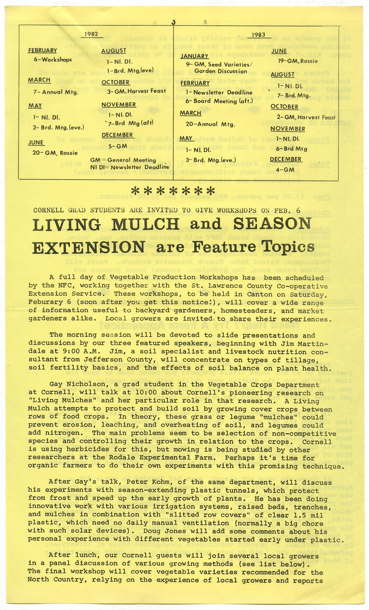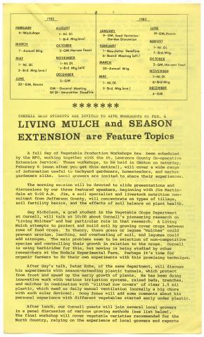 "Cornell Grad Students are Invited to Give Workshops on Feb. 6; Living Mulch and Season Extension are Featured Topics." Newsletter of the Natural Farmers' Co-operative of the St. Lawrence Valley, Inc. (Winter 1982): 3-4.