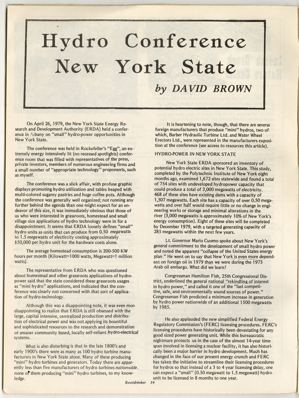PDF:rootdrinker_v3_n13_1979_34-35.pdf(1.14 MB) Overview Issue:Rootdrinker; Volume 3, Number 13, Autumn 1979 Bibliographic Citation:Brown, David. "Hydro Conference New York State." Rootdrinker 3.13 (1979): 34-35. Journal Title:Rootdrinker Creator: Brown, David Subject: Source:Original format: Published in Rootdrinker, volume 3, number 13, 1979. ODY Special Collections F127.S23 R66 Language:eng Start Page 34 Relation:Back to the Land Rights Rights Management:Original materials may be protected by the Copyright Law of the United States (more information). Resource Identifier:ODY Special Collections F127.S23 R66 Technical Digitization Specifications:Scanned at 600ppi on Epson 1000XL scanner as 48-bit RGB uncompressed TIFF images. Images resized to 1200 pixels wide, 150 dpi, and saved as JPEG (level 7) in Photoshop CS4 with Unsharp Mask of 60:1. Date Digital:March 6, 2010 - 20:00 Format:text/html Type:Text
