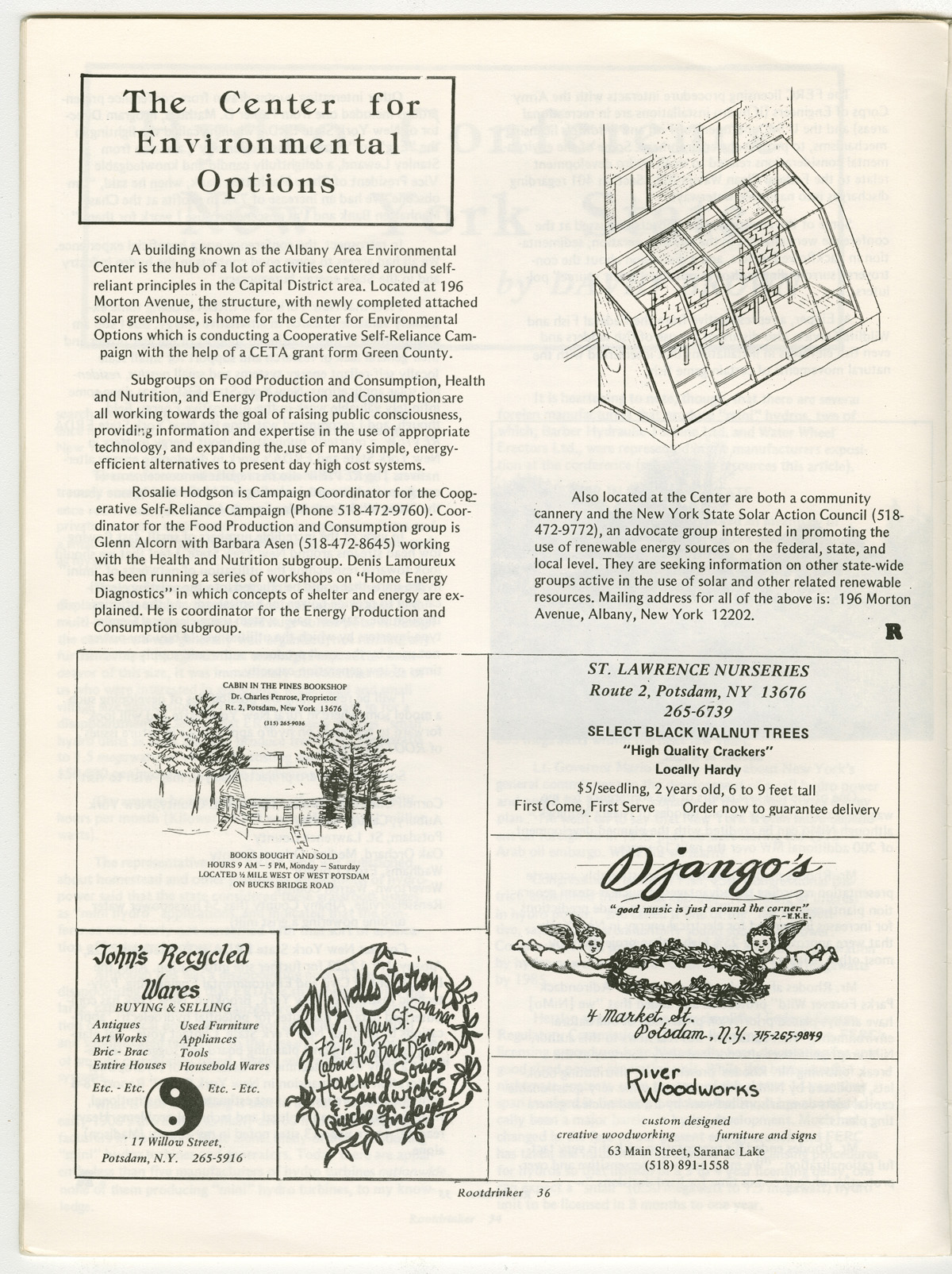 PDF:rootdrinker_v3_n13_1979_36.pdf(753.86 KB) Overview Issue:Rootdrinker; Volume 3, Number 13, Autumn 1979 Bibliographic Citation:"The Center for Environmental Options." Rootdrinker 3.13 (1979): 36. Journal Title:Rootdrinker Creator: Subject: Source:Original format: Published in Rootdrinker, volume 3, number 13, 1979. ODY Special Collections F127.S23 R66 Language:eng Start Page 36 Relation:Back to the Land Rights Rights Management:Original materials may be protected by the Copyright Law of the United States (more information). Resource Identifier:ODY Special Collections F127.S23 R66 Technical Digitization Specifications:Scanned at 600ppi on Epson 1000XL scanner as 48-bit RGB uncompressed TIFF images. Images resized to 1200 pixels wide, 150 dpi, and saved as JPEG (level 7) in Photoshop CS4 with Unsharp Mask of 60:1. Date Digital:March 6, 2010 - 20:00 Format:text/html Type:Text