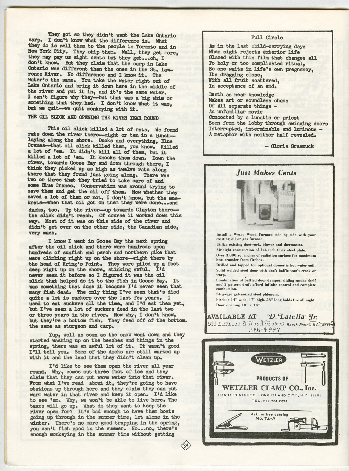 PDF:rootdrinker_v3_n9_1978-32.pdf(938.93 KB) Overview Issue:Rootdrinker: A Journal of the St. Lawrence Border Country; Volume 3, Number 9, Spring 1978 Bibliographic Citation:Grasmuck, Gloria. "Full Circle." Rootdrinker 3.9 (1978): 32. Journal Title:Rootdrinker Creator: Grasmuck, Gloria Subject: Source:Original format: Published in Rootdrinker, volume 3, number 9, 1978. ODY Special Collections F127.S23 R66 Language:eng Start Page 32 Relation:Back to the Land Rights Rights Management:Original materials may be protected by the Copyright Law of the United States (more information). Resource Identifier:ODY Special Collections F127.S23 R66 Technical Digitization Specifications:Scanned at 600ppi on Epson 1000XL scanner as 48-bit RGB uncompressed TIFF images. Images resized to 1200 pixels wide, 150 dpi, and saved as JPEG (level 7) in Photoshop CS4 with Unsharp Mask of 60:1. Date Digital:March 15, 2010 - 21:00 Format:text/html Type:Text