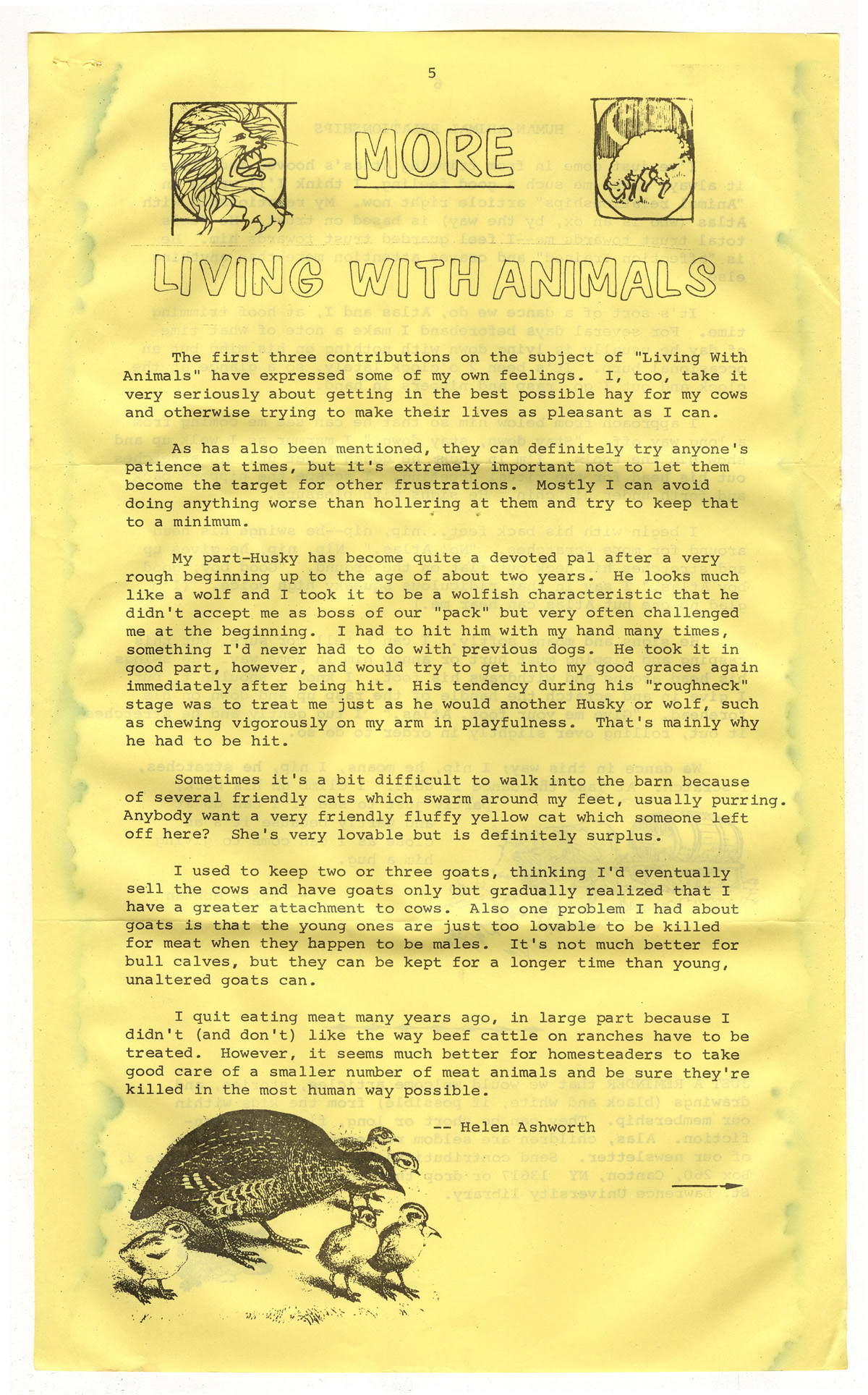 PDF:rla_newsletter_february_1984_5.pdf(433.41 KB) Overview Issue:Newsletter of the Rural Life Association; February 1984 Bibliographic Citation:Ashworth, Helen. "More Living With Animals." Newsletter of the Rural Life Association. February (1984): 5. Journal Title:Newsletter of the Rural Life Association Creator: Ashworth, Helen Subject: Source:Original format: Published in the Newsletter of the Rural Life Association, February 1984. Language:eng Start Page 5 Relation:Back to the Land Rights Rights Management:Original materials may be protected by the Copyright Law of the United States (more information). Technical Digitization Specifications:Scanned at 600ppi on Epson 1000XL scanner as 48-bit RGB uncompressed TIFF images. Images resized to 1200 pixels wide, 150 dpi, and saved as JPEG (level 7) in Photoshop CS4 with Unsharp Mask of 60:1. Date Digital:March 25, 2010 - 21:00 Format:text/html Type:Text