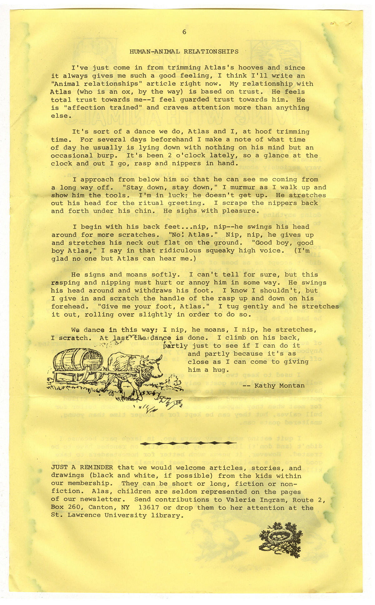 PDF:rla_newsletter_february_1984_6.pdf(418.6 KB) Overview Issue:Newsletter of the Rural Life Association; February 1984 Bibliographic Citation:Montan, Kathy. "Human-Animal Relationships." Newsletter of the Rural Life Association. February (1984): 6. Journal Title:Newsletter of the Rural Life Association Creator: Montan, Kathy Subject: Source:Original format: Published in the Newsletter of the Rural Life Association, February 1984. Language:eng Start Page 6 Relation:Back to the Land Rights Rights Management:Original materials may be protected by the Copyright Law of the United States (more information). Technical Digitization Specifications:Scanned at 600ppi on Epson 1000XL scanner as 48-bit RGB uncompressed TIFF images. Images resized to 1200 pixels wide, 150 dpi, and saved as JPEG (level 7) in Photoshop CS4 with Unsharp Mask of 60:1. Date Digital:March 25, 2010 - 21:00 Format:text/html Type:Text