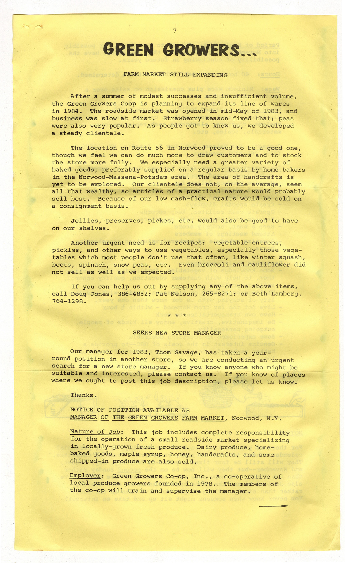PDF:rla_newsletter_february_1984_7-8.pdf(773.96 KB) Overview Issue:Newsletter of the Rural Life Association; February 1984 Bibliographic Citation:"Green Growers..." Newsletter of the Rural Life Association. February (1984): 7-8. Journal Title:Newsletter of the Rural Life Association Creator: Subject: Source:Original format: Published in the Newsletter of the Rural Life Association, February 1984. Language:eng Start Page 7 Relation:Back to the Land Rights Rights Management:Original materials may be protected by the Copyright Law of the United States (more information). Technical Digitization Specifications:Scanned at 600ppi on Epson 1000XL scanner as 48-bit RGB uncompressed TIFF images. Images resized to 1200 pixels wide, 150 dpi, and saved as JPEG (level 7) in Photoshop CS4 with Unsharp Mask of 60:1. Date Digital:March 25, 2010 - 21:00 Format:text/html Type:Text