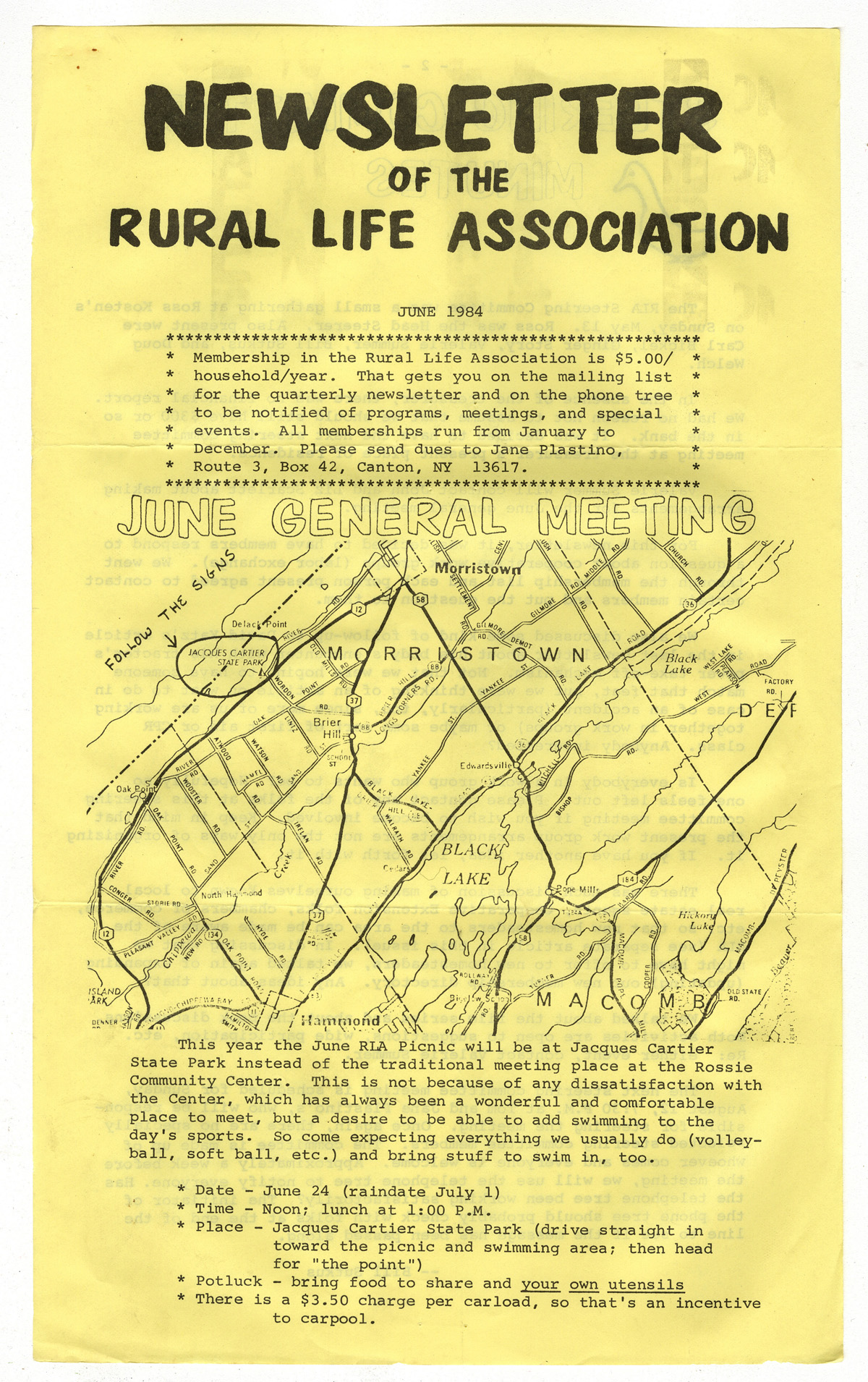 PDF:rla-newsletter-june-1984-1.pdf(447.85 KB) Overview Issue:Newsletter of the Rural Life Association; June 1984 Bibliographic Citation:"June General Meeting". Newsletter of the Rural Life Association. June (1984): 1. Journal Title:Newsletter of the Rural Life Association Creator: Subject: Source:Original format: Published in the Newsletter of the Rural Life Association, June 1984. Language:eng Start Page 1 Relation:Back to the Land Rights Rights Management:Original materials may be protected by the Copyright Law of the United States (more information). Technical Digitization Specifications:Scanned at 600ppi on Epson 1000XL scanner as 48-bit RGB uncompressed TIFF images. Images resized to 1200 pixels wide, 150 dpi, and saved as JPEG (level 7) in Photoshop CS4 with Unsharp Mask of 60:1. Date Digital:March 30, 2010 - 21:00 Format:text/html Type:Text