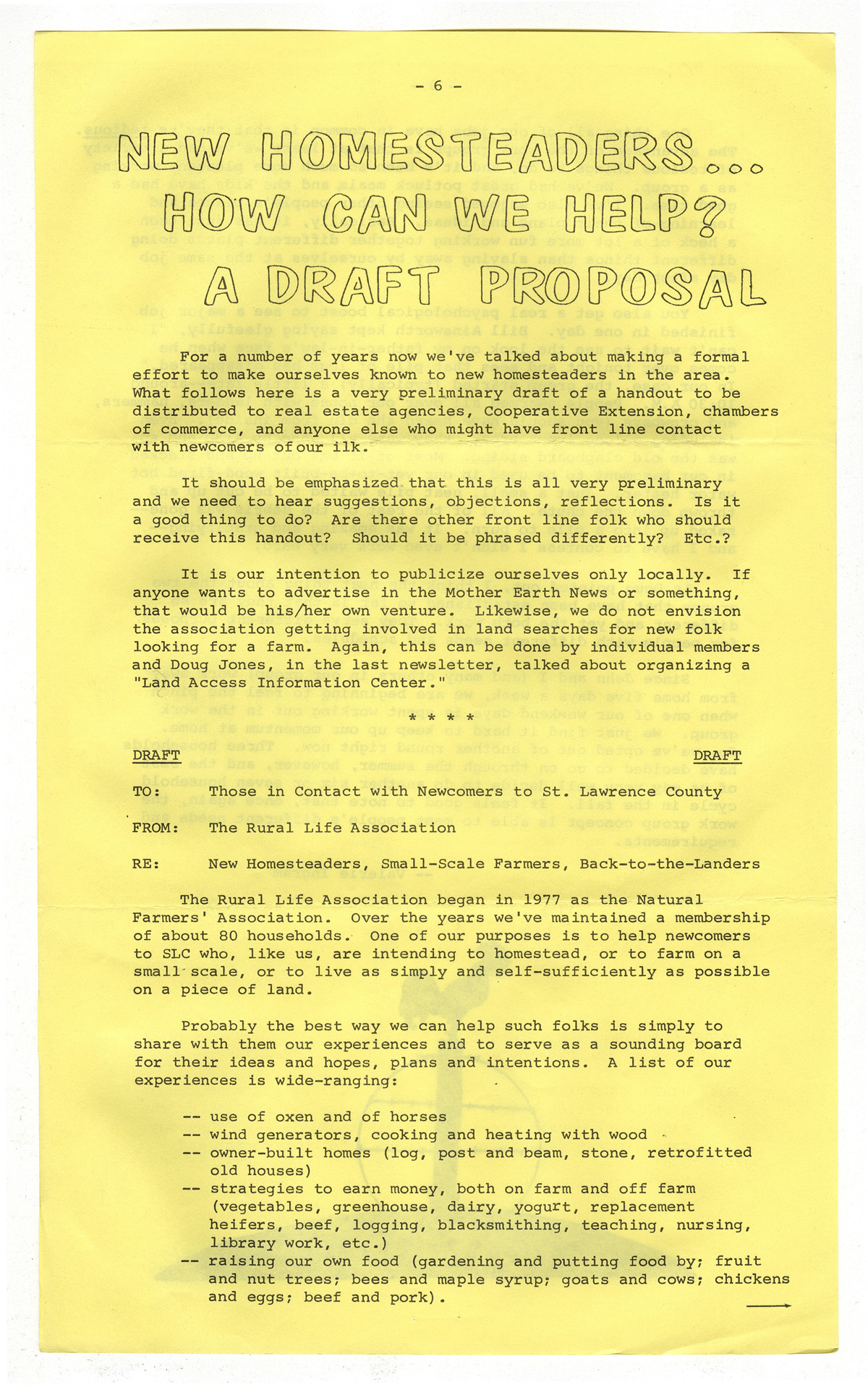 PDF:rla-newsletter-june-1984-6-7.pdf(813.1 KB) Overview Issue:Newsletter of the Rural Life Association; June 1984 Bibliographic Citation:Sutkus, Bill. "New Homesteaders...How Can We Help? A Draft Proposal". Newsletter of the Rural Life Association. June (1984): 6-7. Journal Title:Newsletter of the Rural Life Association Creator: Sutkus, Bill Subject: Source:Original format: Published in the Newsletter of the Rural Life Association, June 1984. Language:eng Start Page 6 Relation:Back to the Land Rights Rights Management:Original materials may be protected by the Copyright Law of the United States (more information). Technical Digitization Specifications:Scanned at 600ppi on Epson 1000XL scanner as 48-bit RGB uncompressed TIFF images. Images resized to 1200 pixels wide, 150 dpi, and saved as JPEG (level 7) in Photoshop CS4 with Unsharp Mask of 60:1. Date Digital:March 30, 2010 - 21:00 Format:text/html Type:Text