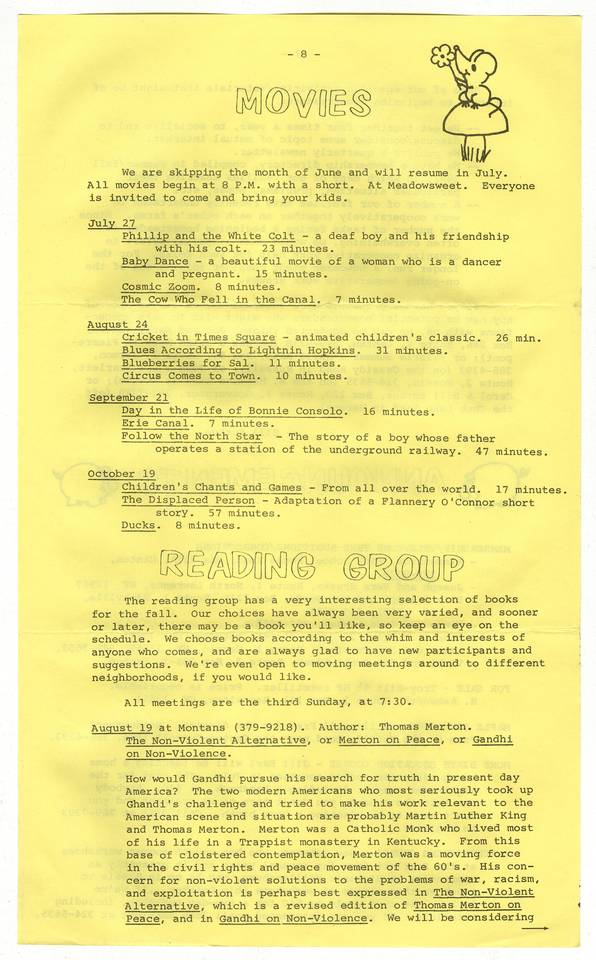 PDF:rla-newsletter-june-1984-8.pdf(374.27 KB) Overview Issue:Newsletter of the Rural Life Association; June 1984 Bibliographic Citation:"Movies". Newsletter of the Rural Life Association. June (1984): 8. Journal Title:Newsletter of the Rural Life Association Creator: Subject: Source:Original format: Published in the Newsletter of the Rural Life Association, June 1984. Language:eng Start Page 8 Relation:Back to the Land Rights Rights Management:Original materials may be protected by the Copyright Law of the United States (more information). Technical Digitization Specifications:Scanned at 600ppi on Epson 1000XL scanner as 48-bit RGB uncompressed TIFF images. Images resized to 1200 pixels wide, 150 dpi, and saved as JPEG (level 7) in Photoshop CS4 with Unsharp Mask of 60:1. Date Digital:April 4, 2010 - 21:00 Format:text/html Type:Text